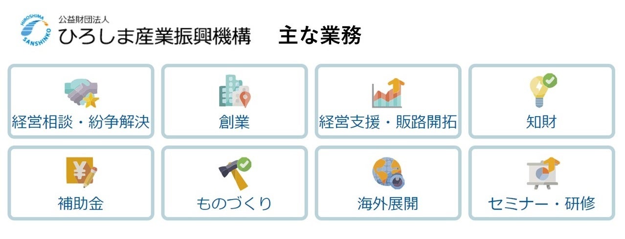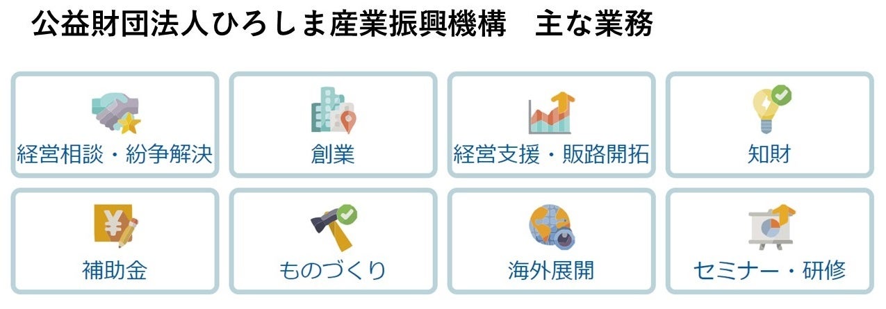 公益財団法人ひろしま産業振興機構様は、広島県内産業の発展のため、県内企業等の様々な取り組みを総合的にバックアップし、産学官連携による新技術・新製品開発や、創業・新事業展開、経営革新、経営基盤の強化、国際ビジネスの支援などを行っております。