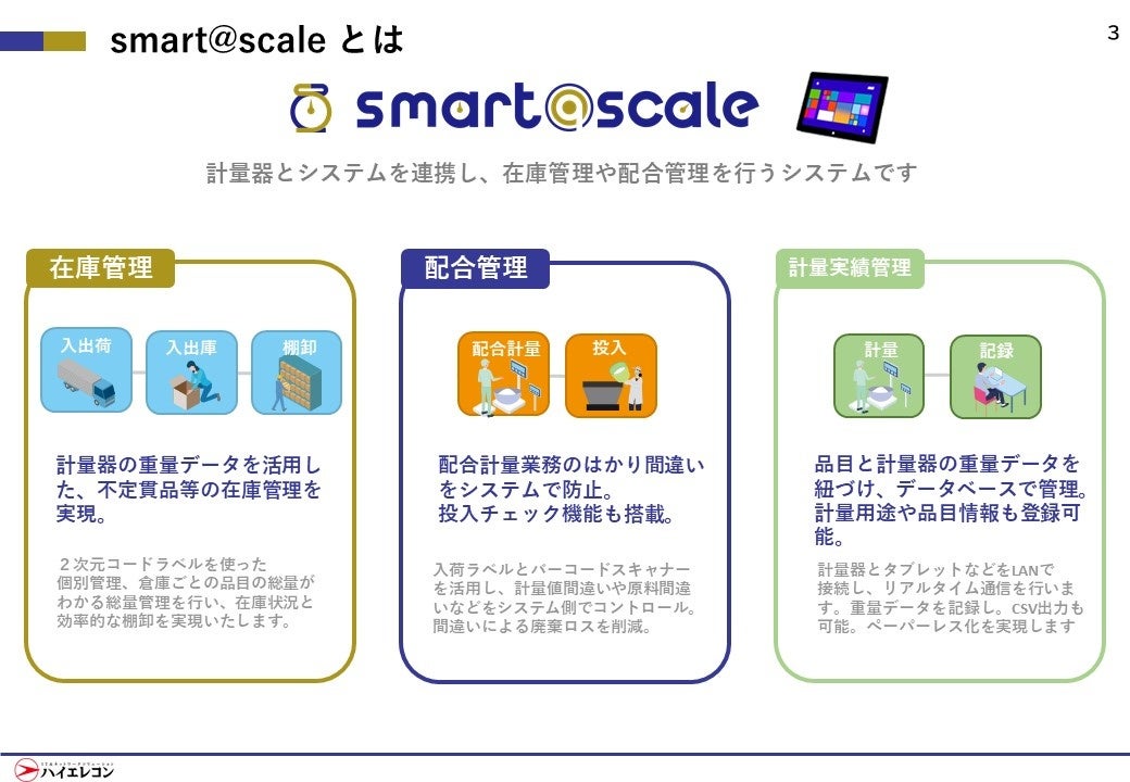 「smart@scale -スマートアットスケール-」とは、手作業での配合計量業務を効率的かつ正確に行うための配合計量支援システムです。計量器とタブレットをリアルタイムに連携し、作業指示を登録することで作業間違いを未然に防ぎ、原料在庫管理やトレース、ペーパレス化なども実現します。