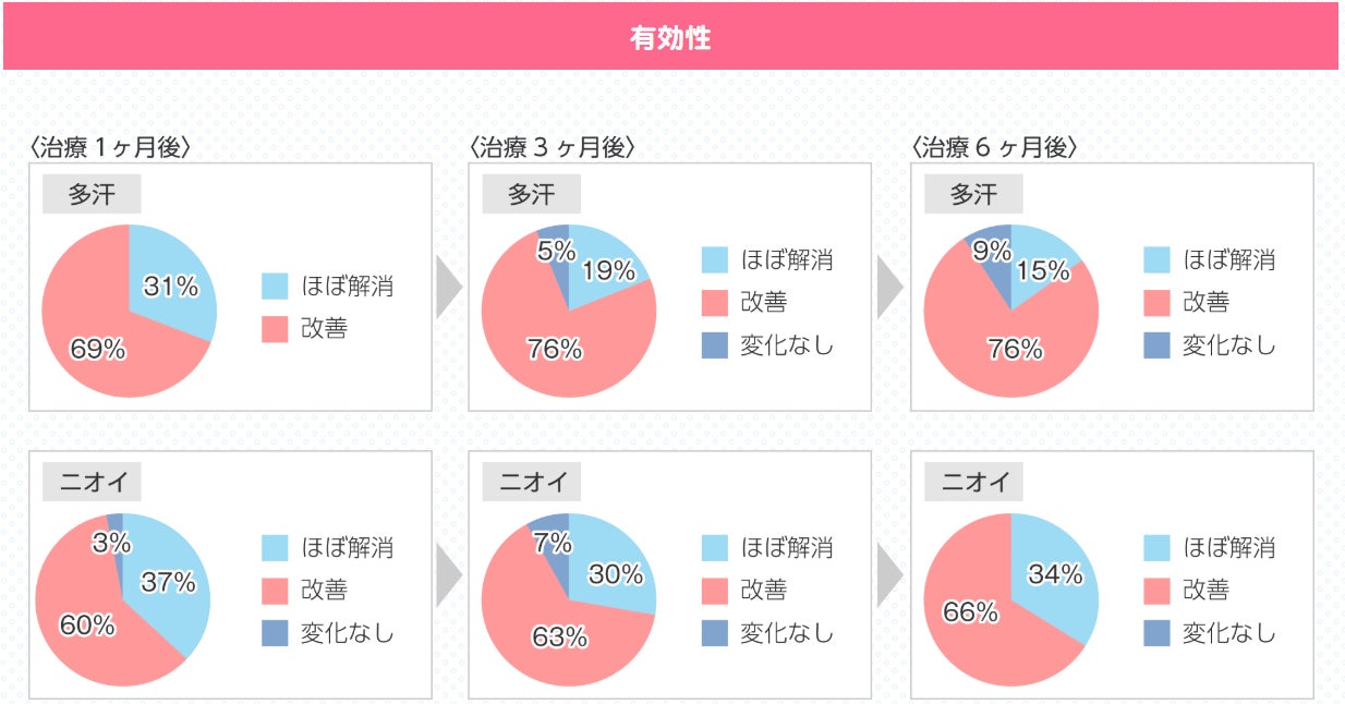 ミラドライ治療の結果、ほとんどの患者さまが多汗やニオイの症状について「ほぼ解消」または「改善」と回答しています。また、治療1ヶ月後よりも6ヶ月を経過したあとのほうが、「改善」と答えた割合が高くなる傾向が見られます。