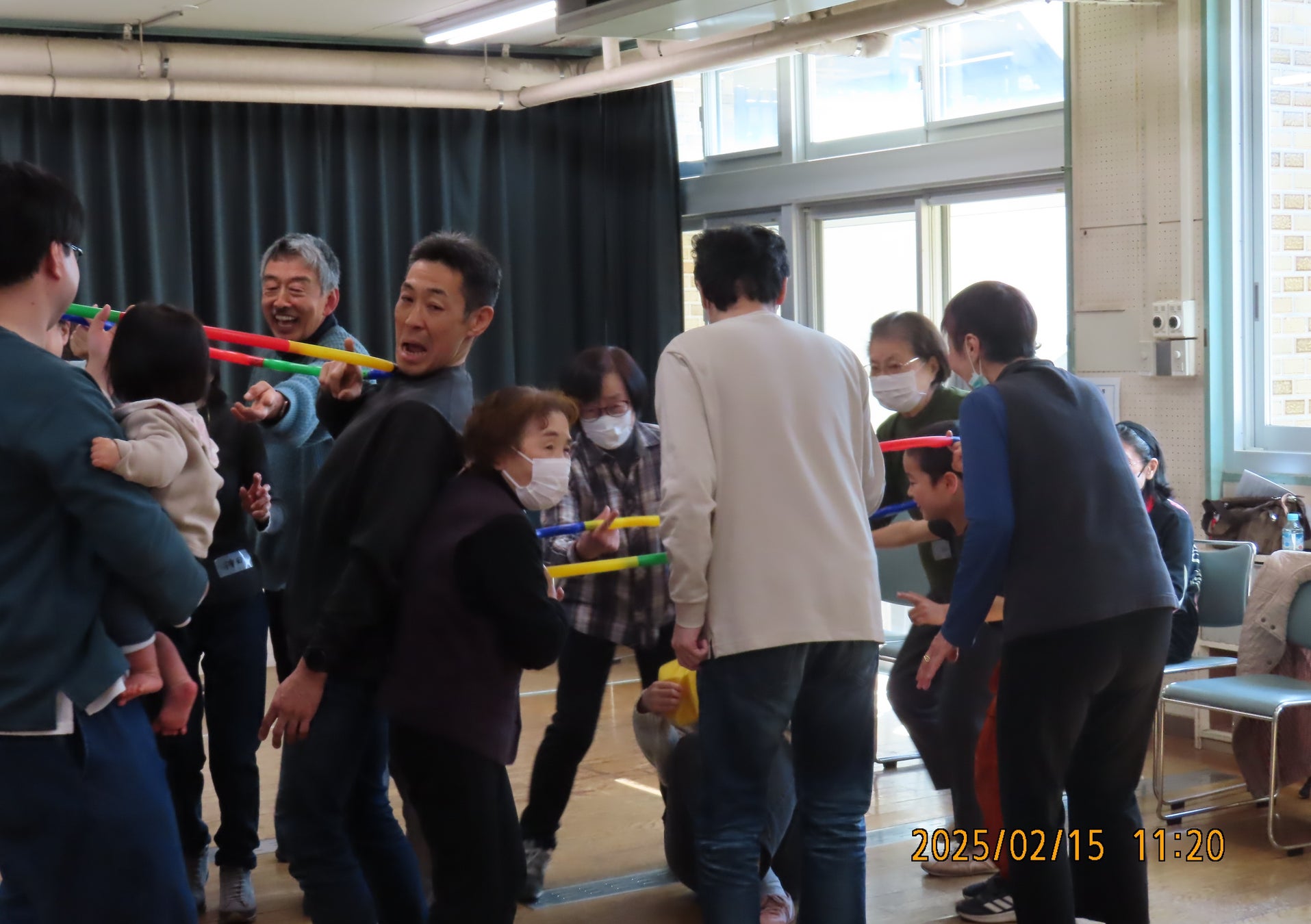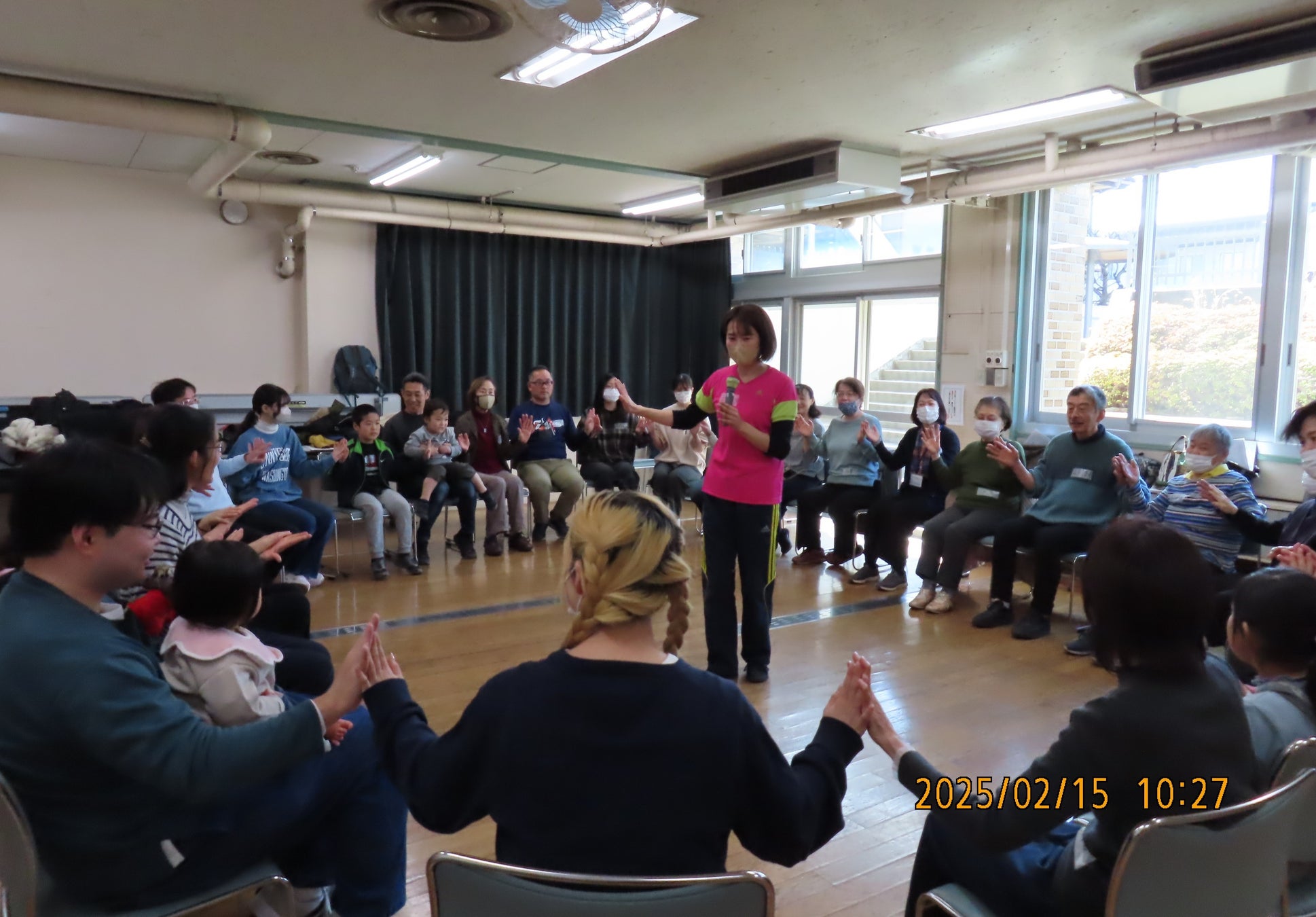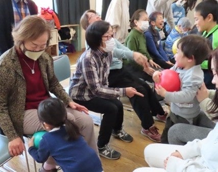 実施3回目となる今回は、武蔵野市西久保コミュニティーセンターで2月15日に開催されました。まず、古川講師が「みんなでみんなを支援する」と題したミニセミナーで、高齢者や子どもが互いの特性を活かした支え合いの可能性などについて説明をした後、子どもから高齢者まで避難所で心身の健康維持ができる運動プログラムの体験などが行われました。1歳から90歳台まで幅広い年代の参加者29人は、歌いながら互いの手を叩きあうリズム運動や体で挟んだボールを取り合うゲームなどを行い、筋力や柔軟性などを鍛えながら笑顔で多世代間の交流を楽しみました。