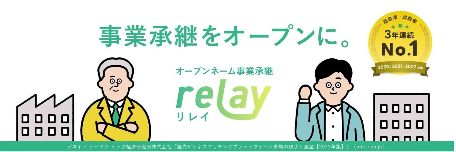 オープンネーム事業承継「relay(リレイ)」は、従来社名や企業情報が伏せられてきた事業承継のマッチングをオープンネームで行い、従来のマッチングサービスでは可視化されなかった中小規模事業者の「想い」をストーリー化してプラットフォームに掲載。これに応じる熱意ある後継ぎ候補を広く公募することで、価値観への共感をベースとした新しい事業承継の形を提供しています。