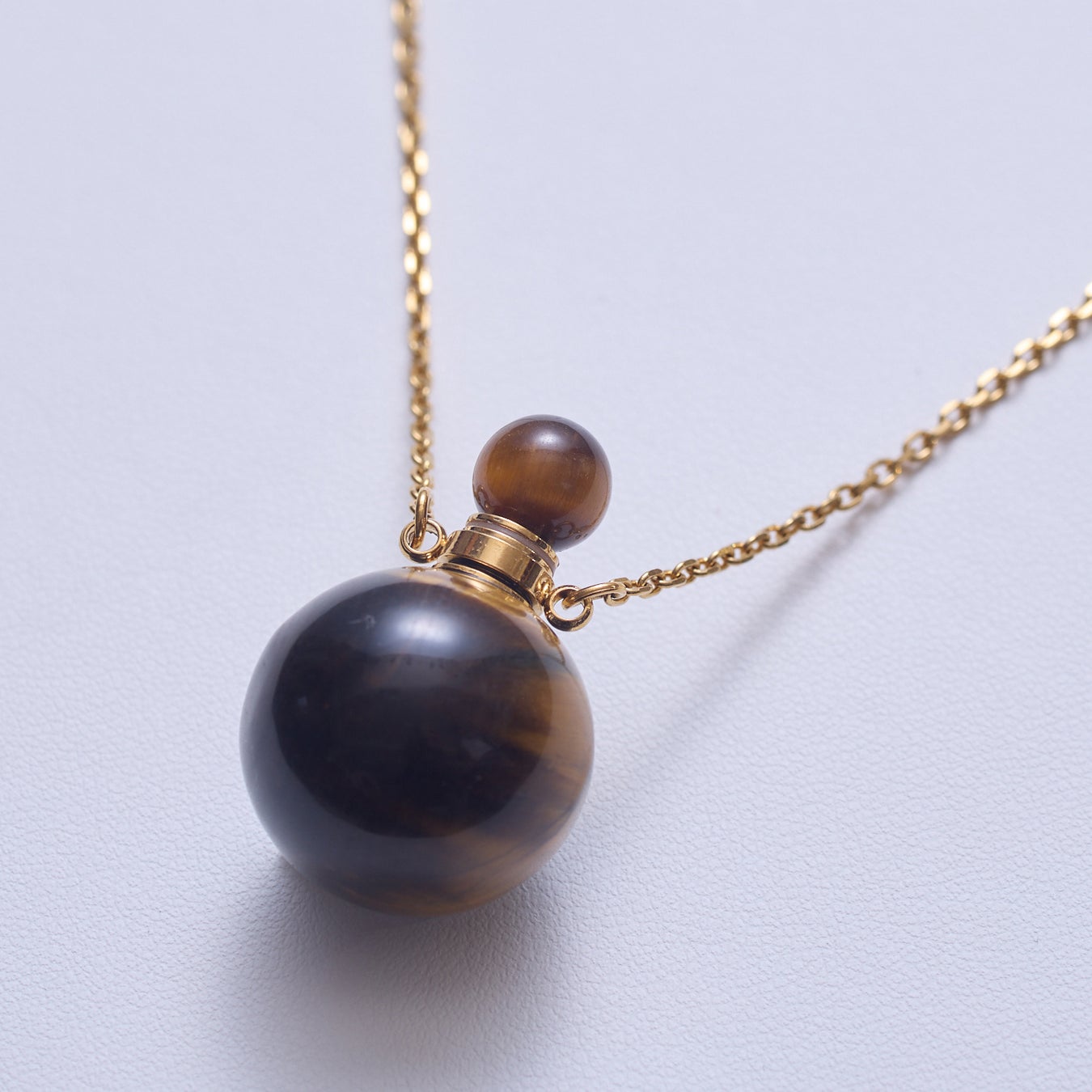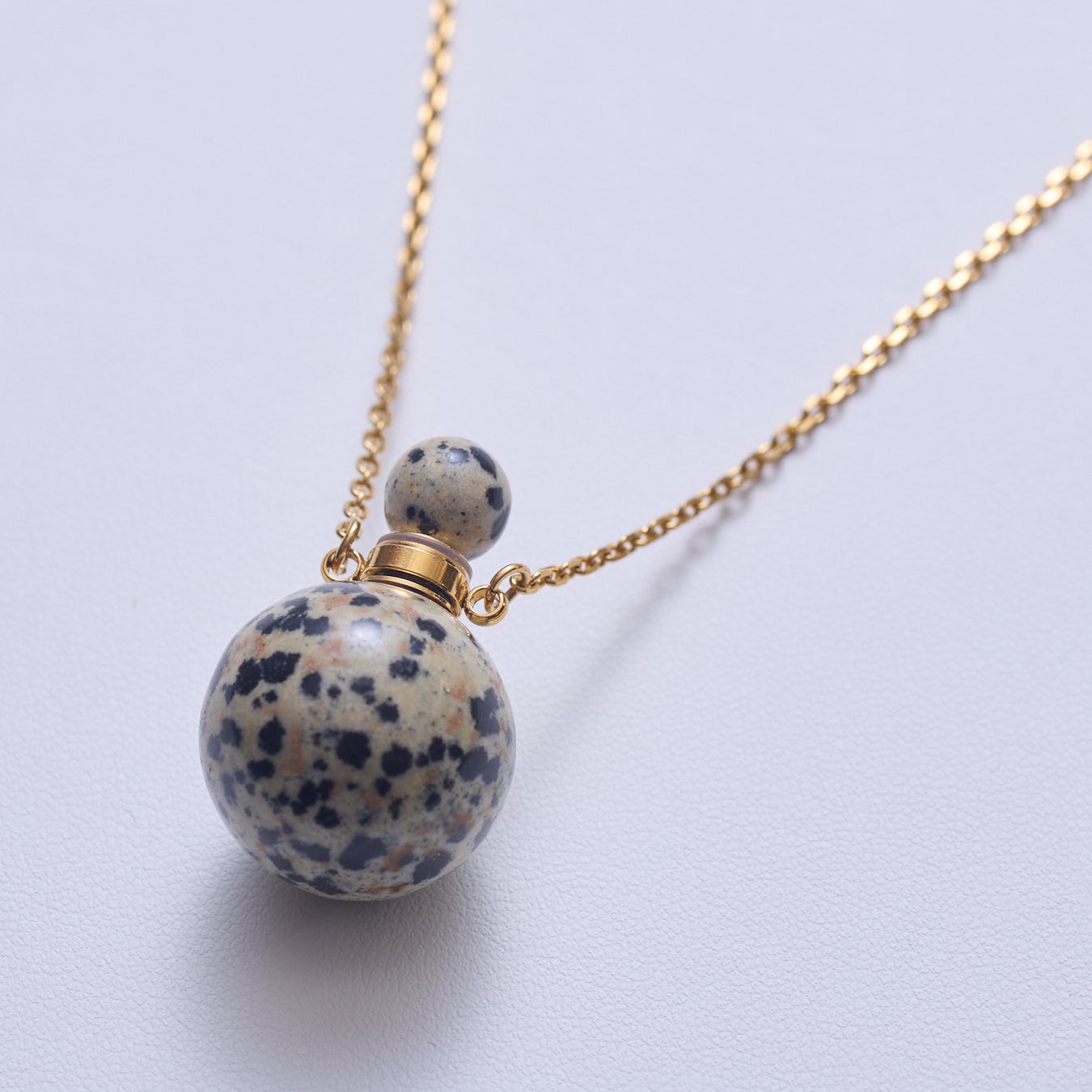 お気に入りの香水やオイルをボトル内に入れて持ち歩くことができるクラス感のあるデザインで、神秘的な魅力が漂います。天然石の種類は全6種。天然石の効果に願いを込めて、お守りジュエリーとして身につけていただくのもおすすめです。