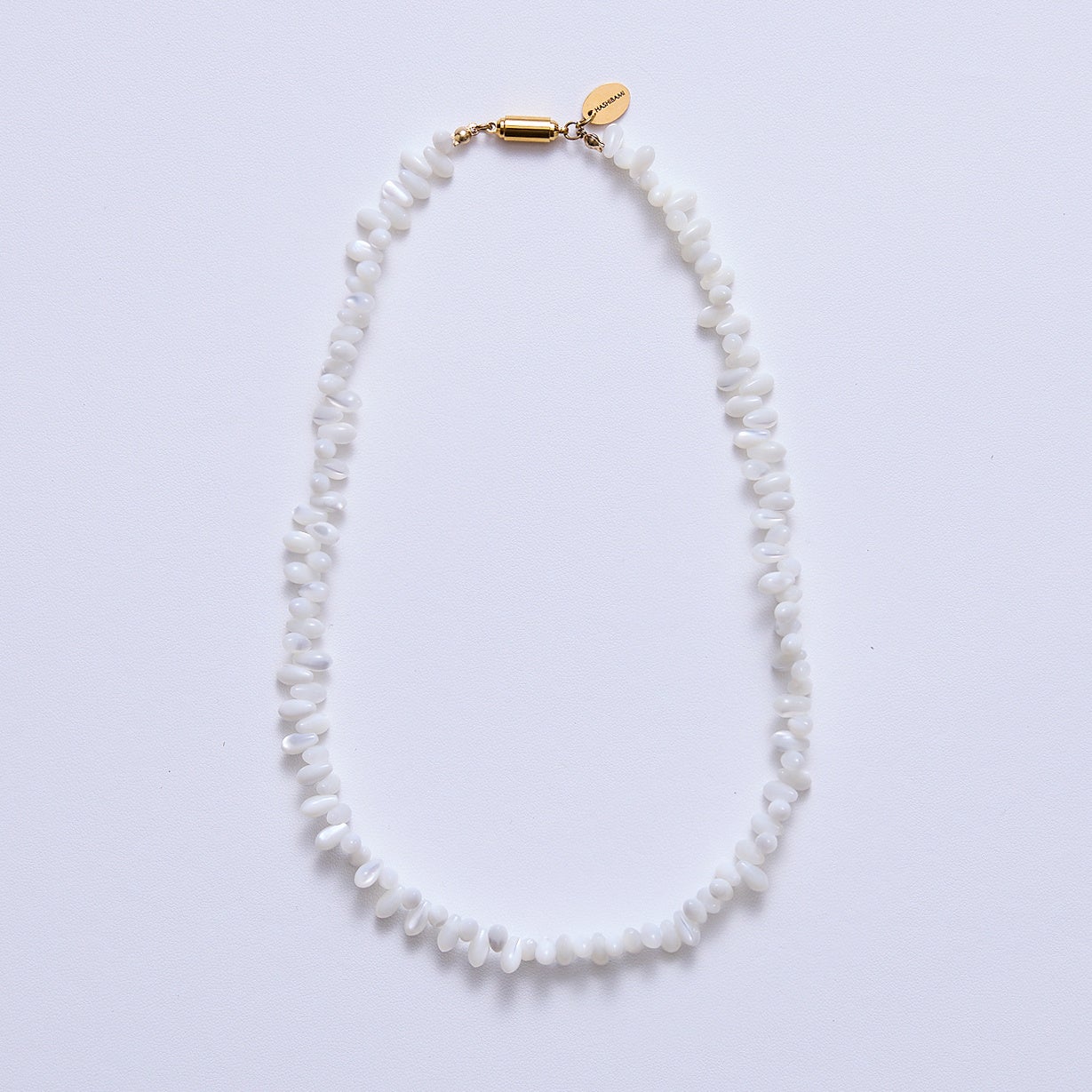 ドロップ型の天然貝〈マザーオブパール〉を使用したショートタイプのシリーズは、HASHIBAMI(ハシバミ)のブランドコンセプトでもある、【少しの”淡さ” とほんのり香る控えめな ”甘さ”】のエッセンスを取り込んだフェミニンなライン。ひとつひとつのパーツの色味や輝きが異なるのは、自然が作り出す天然貝ならではの特徴です。