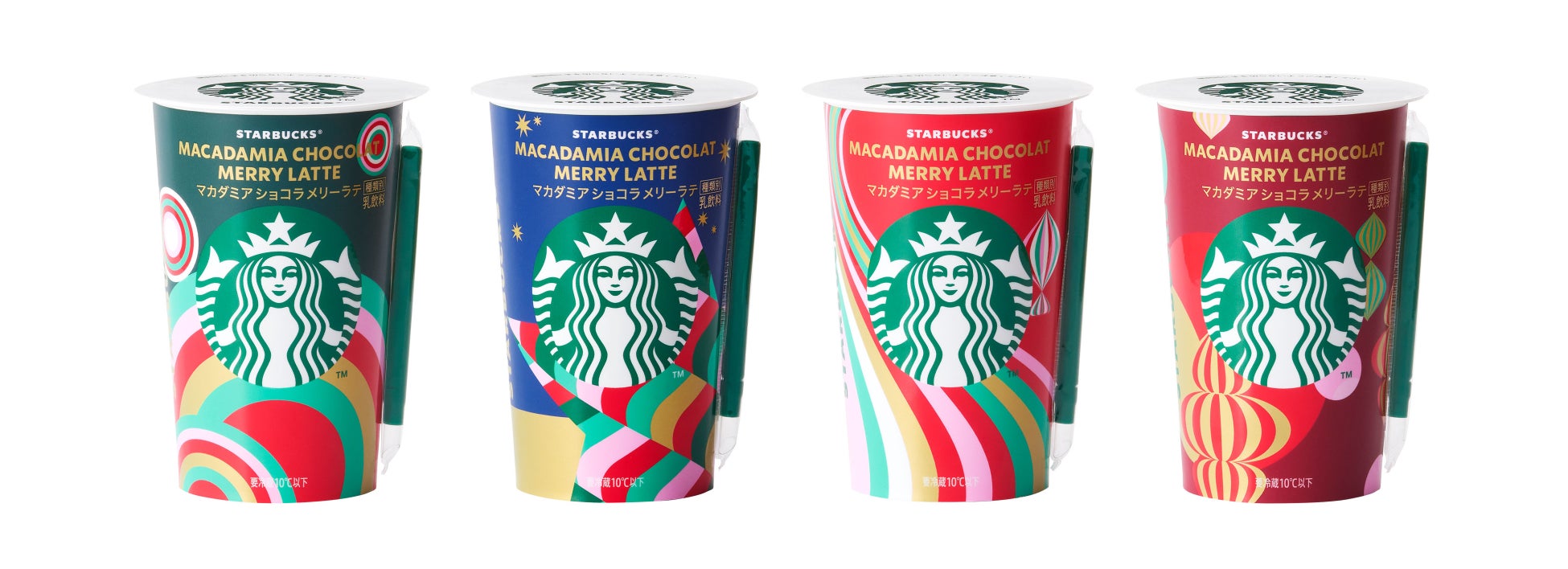 スターバックス® チルドカップシリーズでは、毎年ホリデーシーズン※限定商品を発売しご好評をいただいています。今年は、「もっと、楽しもう。それぞれのホリデーを。」をテーマに、ワクワクするホリデーシーズンにぴったりな甘く濃厚な味わいの「スターバックス® マカダミア ショコラ メリーラテ」を、4種類の心弾むパッケージデザインと共に展開します。ドリンクの贅沢な味わいをお楽しみいただけるのはもちろん、ホリデーシーズンで増えるパーティーでのさまざまなスイーツやフードとも相性が良いドリンクで、気分をより一層盛り上げます。