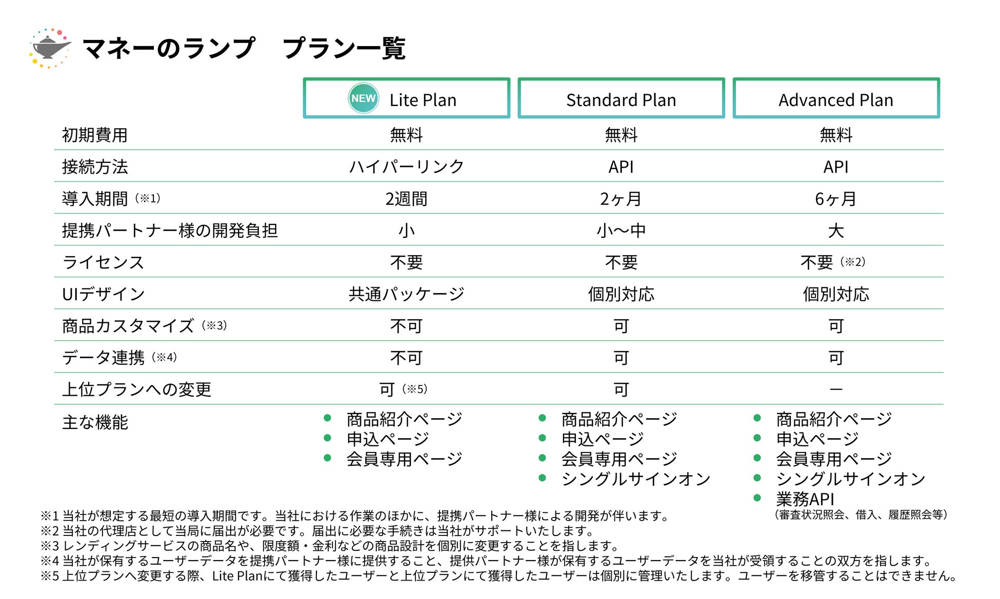 「マネーのランプ」はこれまで、API接続による導入プラン「Standard Plan」「Advanced Plan」を提供してまいりましたが、この度、ハイパーリンク挿入による導入プラン「Lite Plan」の提供を開始いたします。「Lite Plan」は、提携パートナー様が展開するWebサービスやアプリ上での個人向けローンの提供開始を最短2週間で実現する、最も手軽な「マネーのランプ」導入プランとなります。なお、「マネーのランプ」は、いずれのプランでも初期費用不要で導入いただけます。低コストかつ短期間でレンディング事業を始めてみたい、という企業のニーズにお応えします。