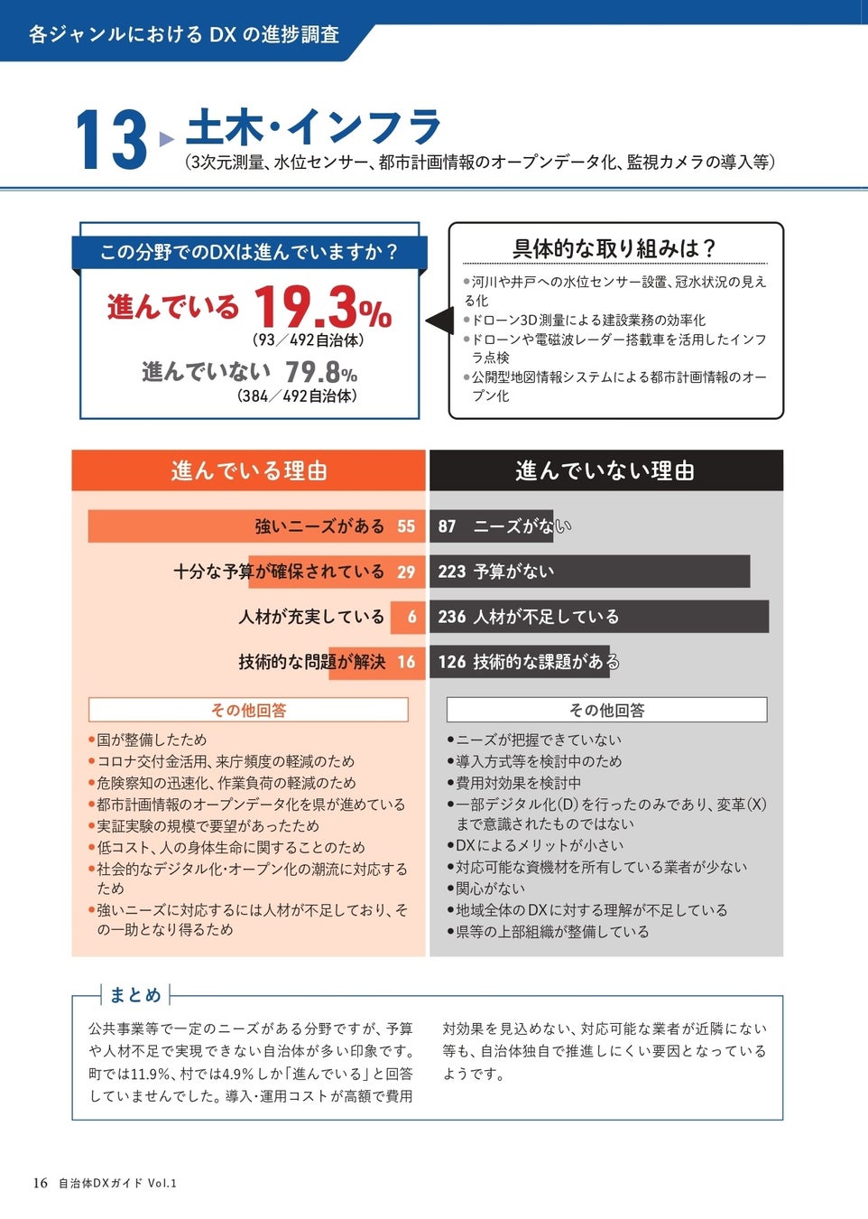 調査のまとめとして、公共事業などで一定のニーズがあるにも関わらず、実現できない自治体が多いとの印象があります。特に町や村では、「進んでいる」と回答している自治体の割合が低く、導入・運用コストの高さや費用対効果の問題、地域事業者の不足などが、自治体独自でのDX推進を困難にしています。
