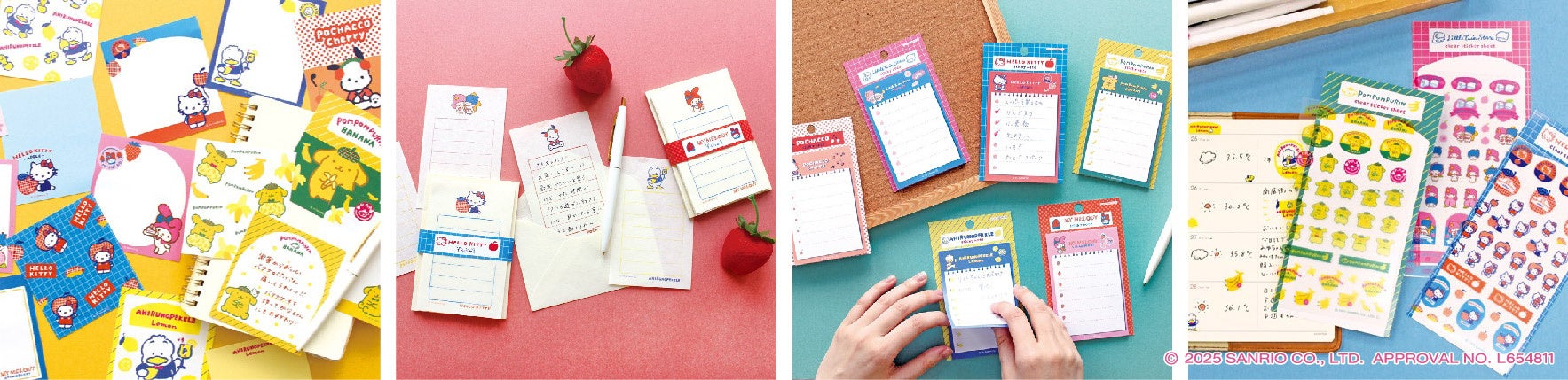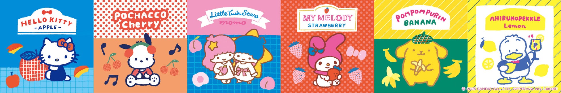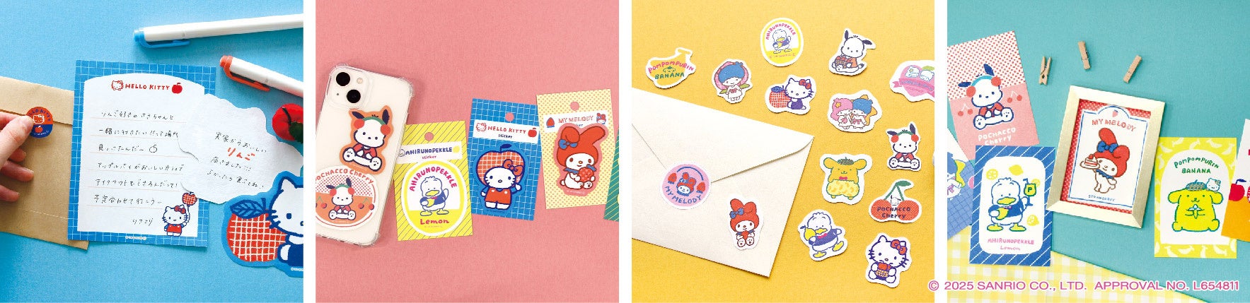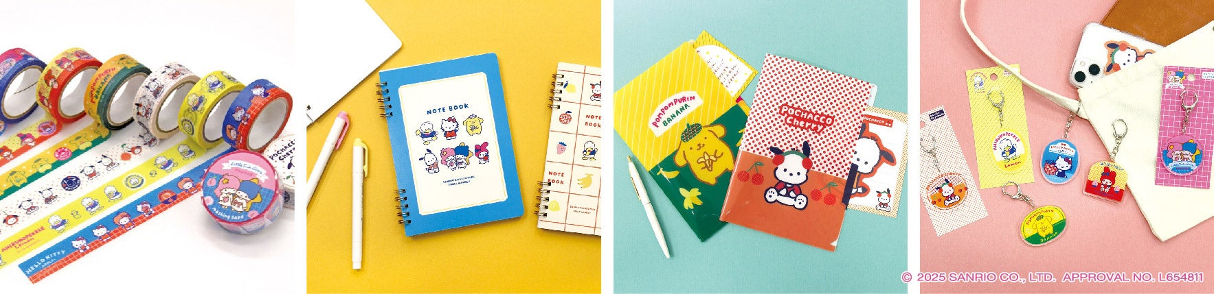 「ハローキティ」「ポチャッコ」「リトルツインスターズ」「マイメロディ」「ポムポムプリン」「あひるのペックル」を自社デザイナーが描きおこした『サンリオフルーツマーケット』シリーズ。それぞれのサンリオキャラクターズに合わせてフルーツとコラボレーション!お気に入りのキャラクターと日常を彩る文具雑貨ができました。
