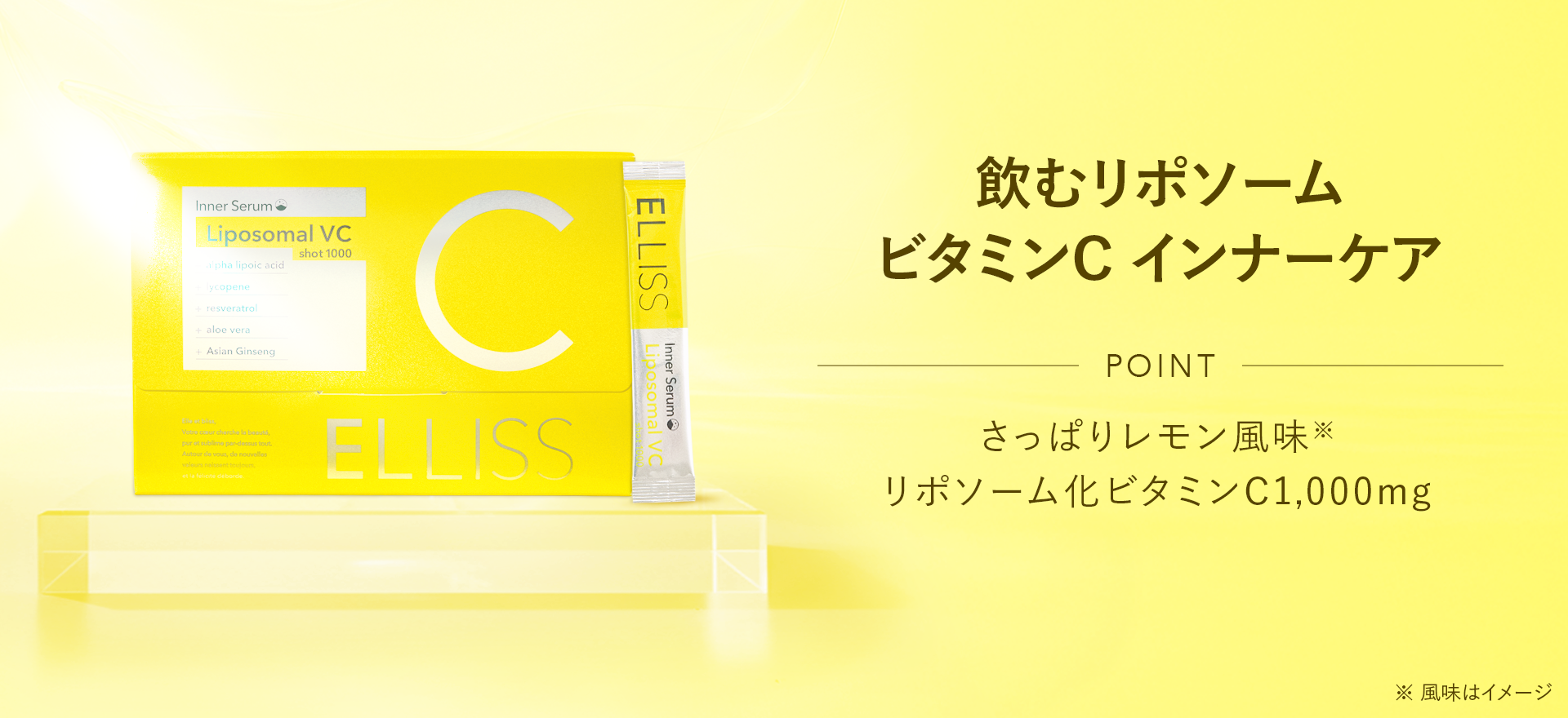 本商品は飲むリポソームビタミンC インナーケアをコンセプトに、リポソームビタミンCを1包あたり1,000mg配合したインナーケアサプリメントです。粉末スティックタイプで、さっぱりとしたレモン風味*⁴のため、毎日の美容習慣として取り入れやすい設計となっています。