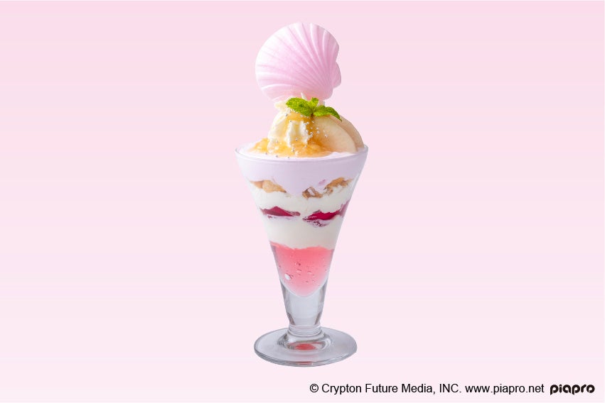 巡音ルカ15周年テーマ曲「ヴィーナス」をイメージしたいちごクリームと桃のパフェ