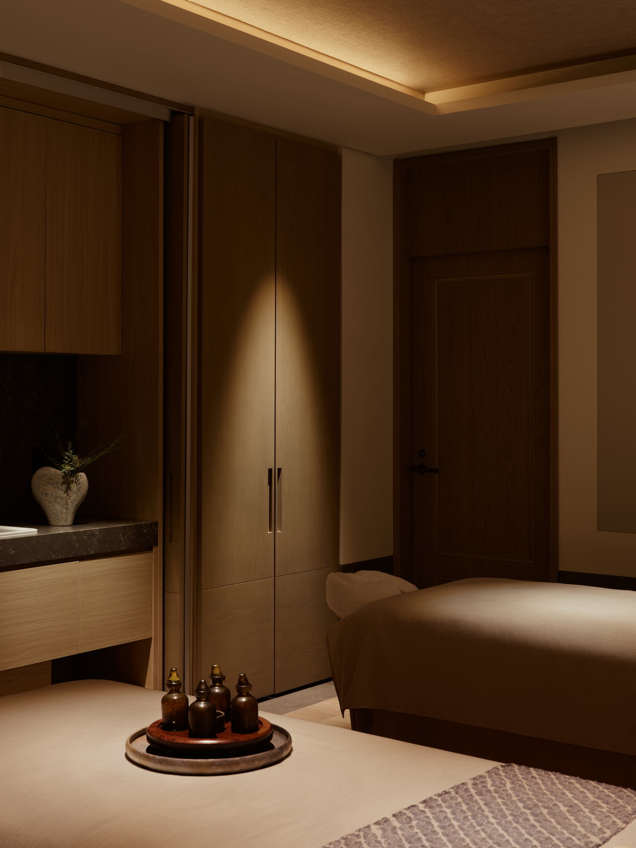 それぞれのスパハウスには、ダブルトリートメントルーム、ホット & コールドバス、リラクゼーションエリア、外気浴ができるバルコニーを完備。異なる文化に息づくサウナ体験を、完全にプライベートな環境でお楽しみいただけます。