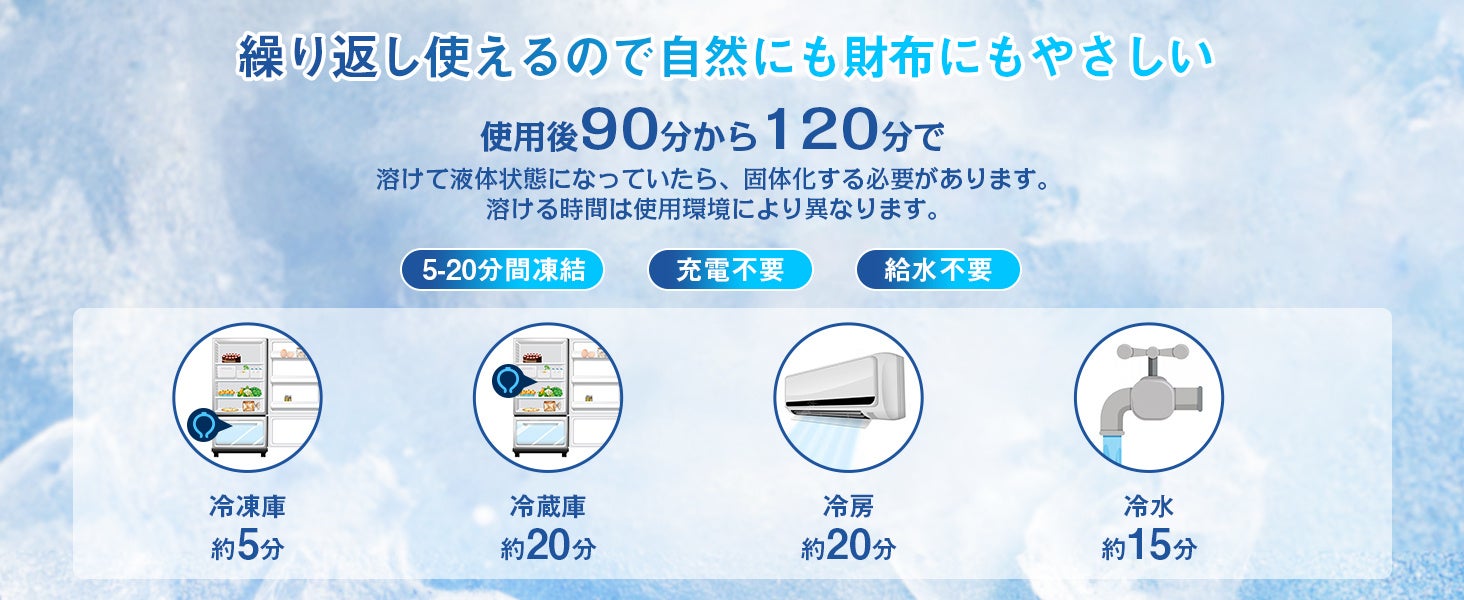 クールリングの中身が液状化しても、エアコンの効いた涼しい空間に置いておくだけで再び凍り、繰り返し使用可能です。環境にもお財布にも優しい設計です。涼しさが足りない場合には、以下の方法をお試しください: