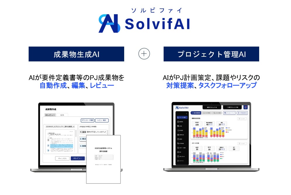 ソルビファイ株式会社は、IT/DXプロジェクトの成功を支援するAI SaaSスタートアップです。独自のAI技術を活用し、ソフトウェアやハードウェアの企画書、RFP、要件定義書等の成果物を自動生成し、プロジェクト管理業務まで自動化する「SolvifAI(ソルビファイ)」を提供しています。