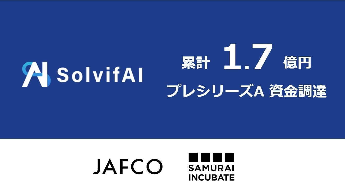 IT/DXプロジェクトの成功を支援するAI SaaSツール「SolvifAI」を提供するソルビファイ株式会社(本社:東京都港区、代表取締役:CEO湯淺元祥/COO染谷凌大、以下「当社」)は、プレシリーズAにおいてジャフコグループ株式会社をリード投資家、株式会社サムライインキュベートを引受先として第三者割当増資を実施し、累計1.7億円の資金調達を実施したことをお知らせいたします。