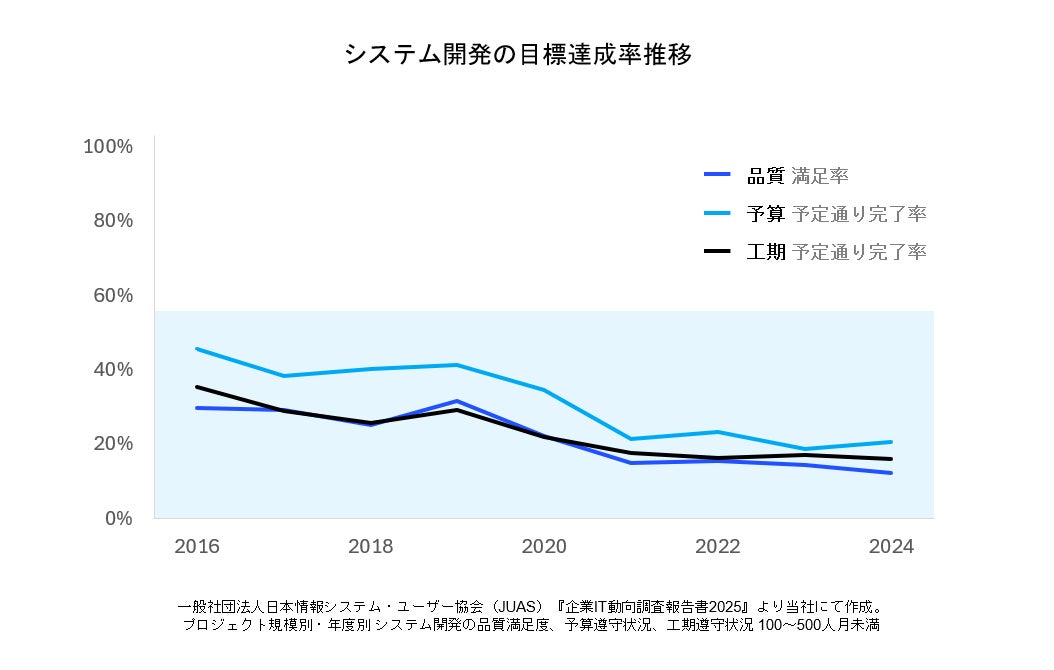 一般社団法人日本情報システム・ユーザー協会(JUAS)の『企業IT動向調査報告書2025』によると、デジタル化社会の根幹をなすシステム開発において、品質・予算・工期の目標達成率は、過去10年間で10~30%台にまで低迷していると報告されています。同調査ではQCD悪化の主な要因としてビジネス環境の複雑化とシステム影響範囲の拡大による「要件定義」の難易度上昇が指摘されています。