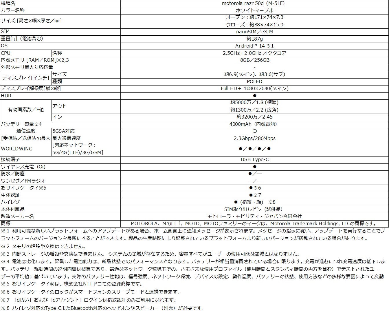 モトローラ・モビリティ・ジャパン合同会社(東京千代田区、モトローラ アジア太平洋地区 エグゼクティブ ディレクター兼モトローラ・モビリティ・ジャパン統括、プラシャンス マニ以下、「モトローラ」)は、株式会社NTTドコモが“NTTドコモ”の新製品として、サステナブルな素材を採用したボディに、美しさを兼ね備えた折りたたみスマートフォン「motorola razr 50d M-51E」を、本日から予約受付を開始し、2024年12月19日に発売しますのでお知らせいたします。株式会社NTTドコモは国内の通信事業者(MNOに限る)として「motorola razr 50d M-51E」をオリジナル販売します。