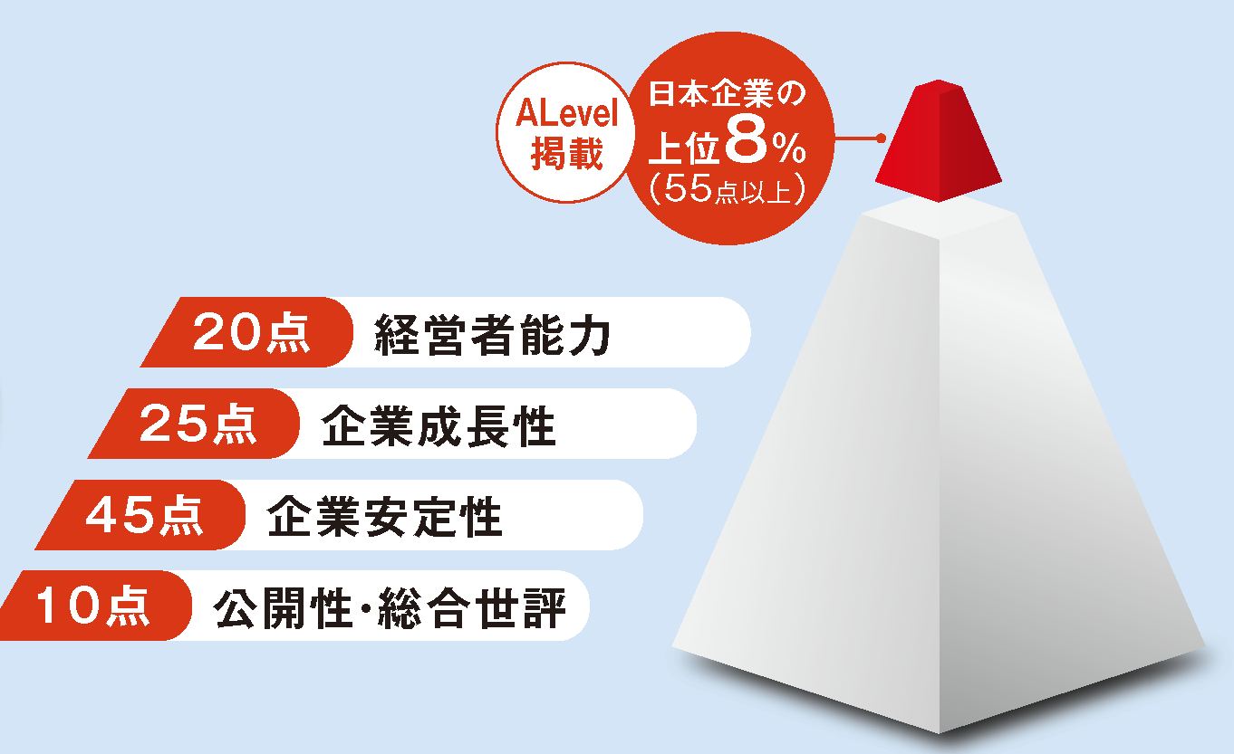 株式会社東京商工リサーチが実施する企業調査で評点が55点以上の企業かつ非上場の企業から厳選して掲載しています。「評点」とは、対象企業を「経営者能力」、「成長性」、「安定性」、「公開性・総合世評」の4つの視点で評価するTSR独自の指標です。その総合点を5つのランクで位置づけています。
