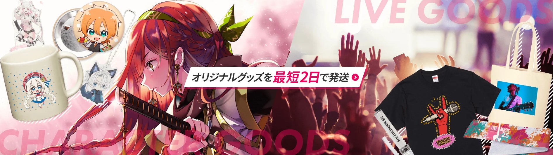 「オリジナルグッズプレス」は、商品にオリジナルデザインをプリントして、ライブ、イベント、キャラクター、同人などエンタメ全般の物販グッズを製作することができるECサイトです。