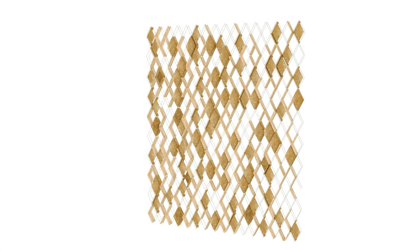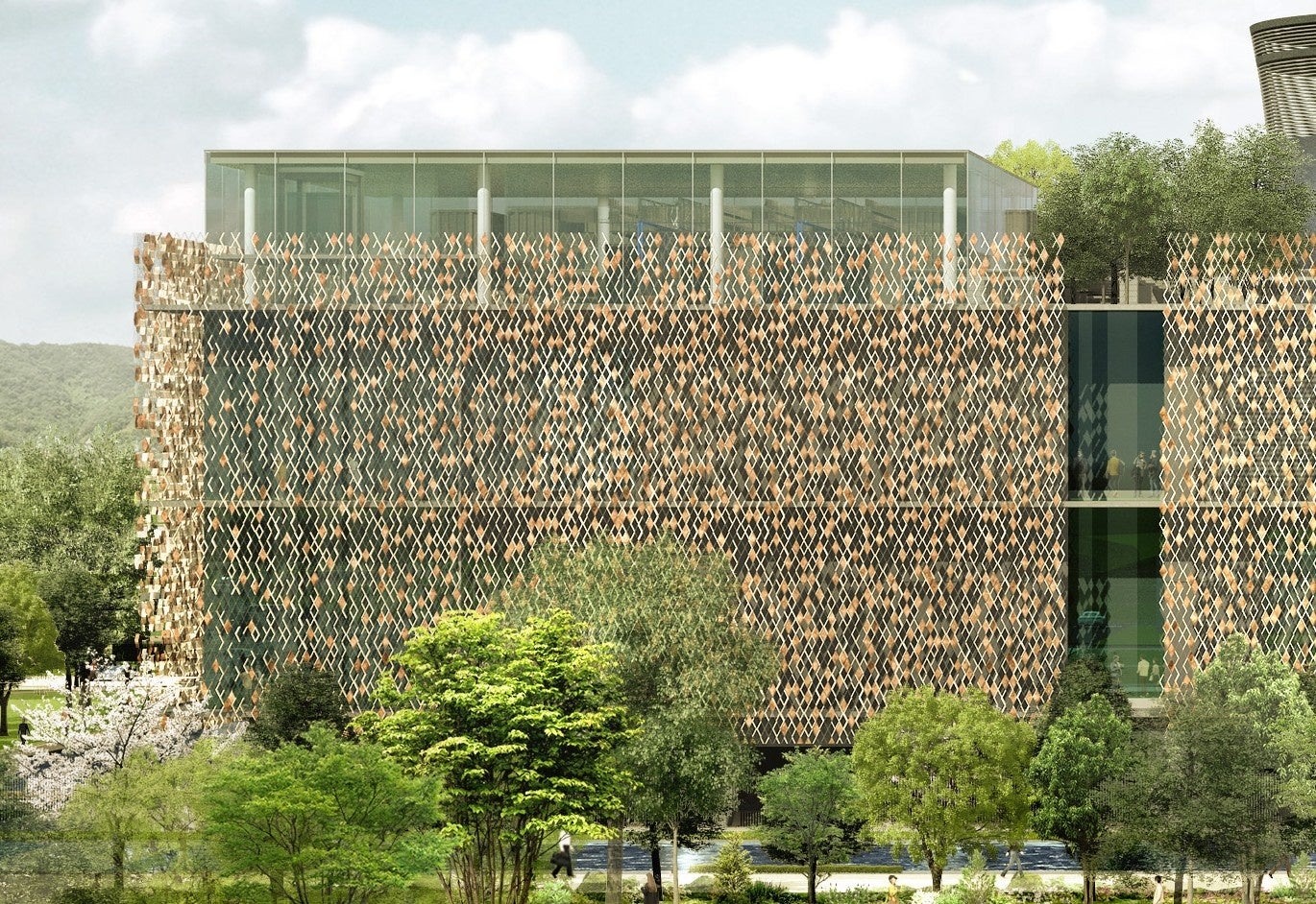 多孔質セラミックタイルは斜め格子状に二重に組んだ引張材(テンションロッド)で支持し、内部の機能に応じて密度を変化させています。