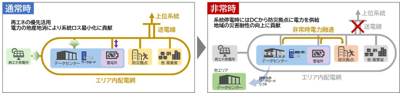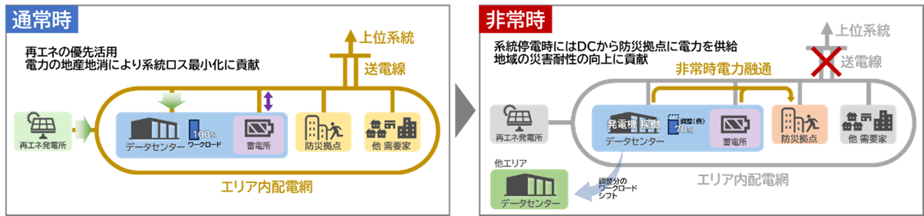 データセンター内には停電時にも安定運用を継続できるようにするため、非常用発電機やUPS(無停電電源装置)を設置しています。災害時にはデータセンター内の電源設備の活用に加えて、周辺の再生可能エネルギー発電所や蓄電所との連携、他エリアのデータセンターへのワークロードシフト*4等により、災害時の地域の防災拠点への電源供給を可能にします。