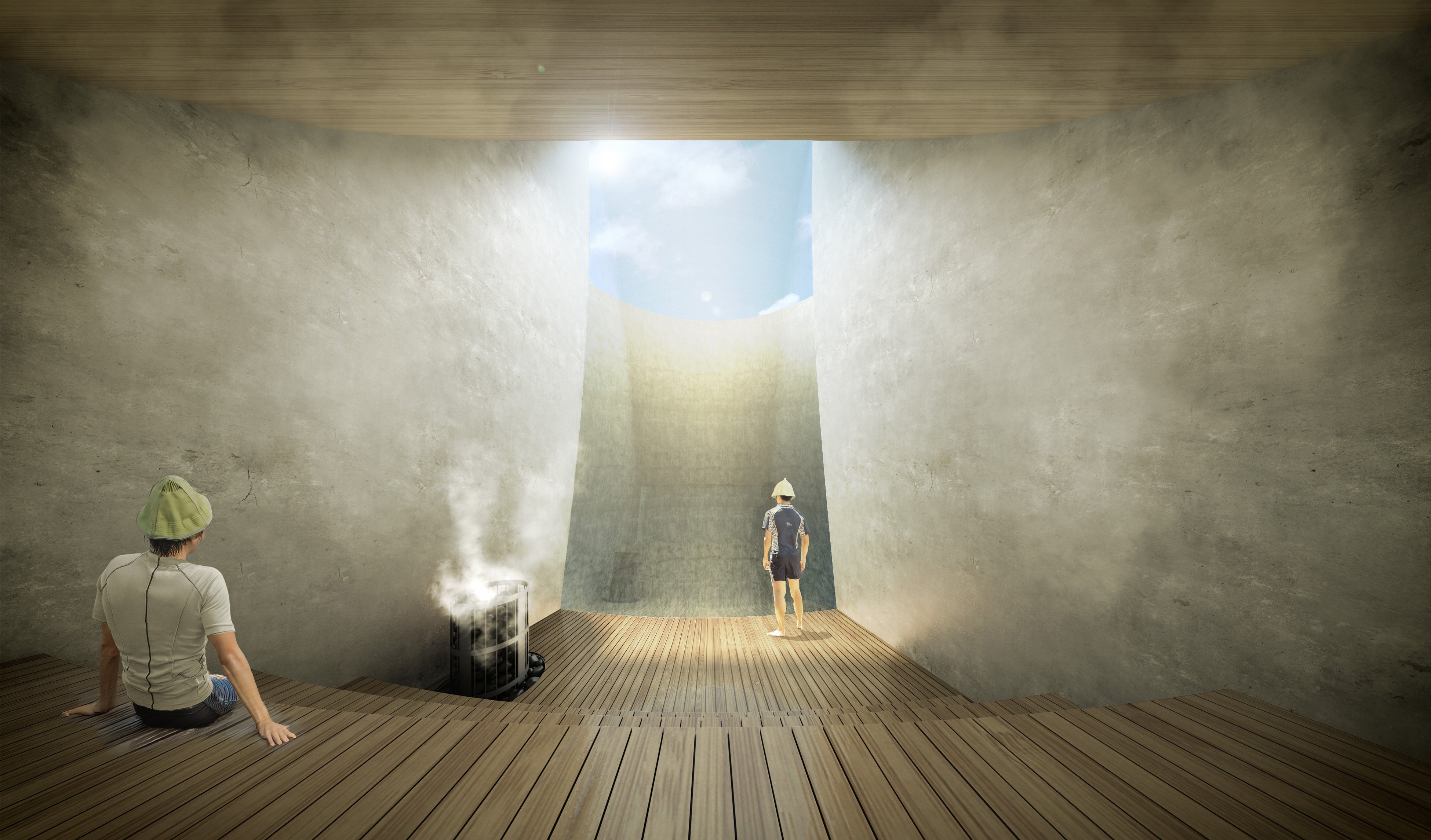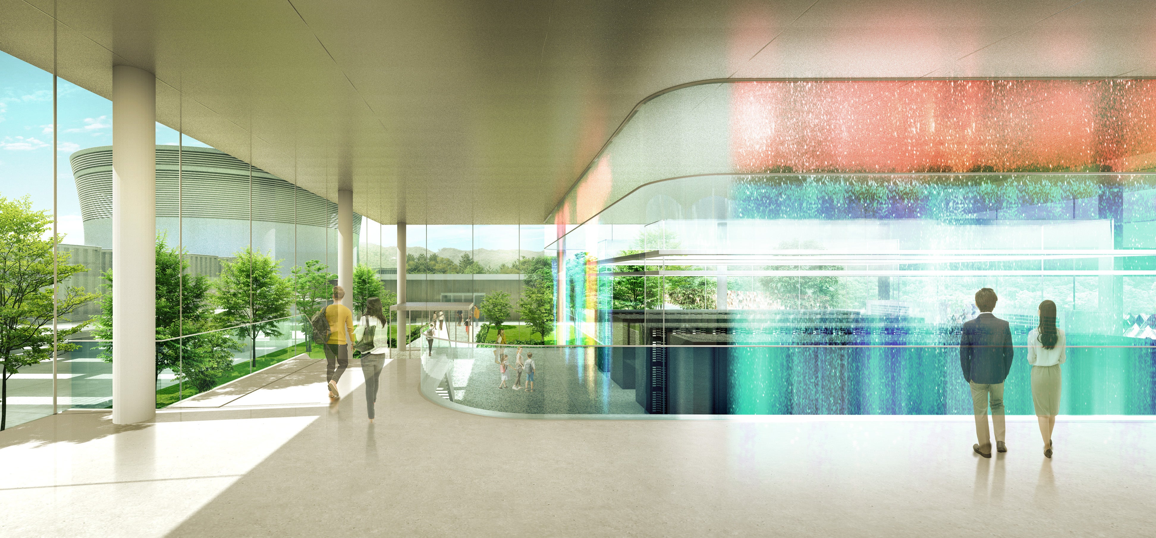 建物中央部に廃熱を集約し、建物1階部分の免震層に生じる空間から気流を生み出す「ヴォイド空間(Hyperbolic Void™*6)」を構築することで、自然通風により廃熱を冷却しながら放出します。また、自然通風により生み出された上昇気流を活用し、散水と組み合わせて液冷サーバー用の冷却液供給に利用します。液冷サーバー用の冷却水の供給は、従来冷却塔等の熱源機器が担ってきましたが、この熱源機器としての機能を、設備ではなく建築の一部分として再構築する新たな取り組みです。