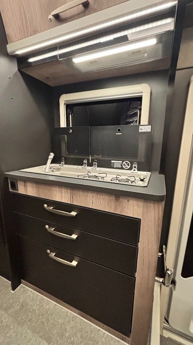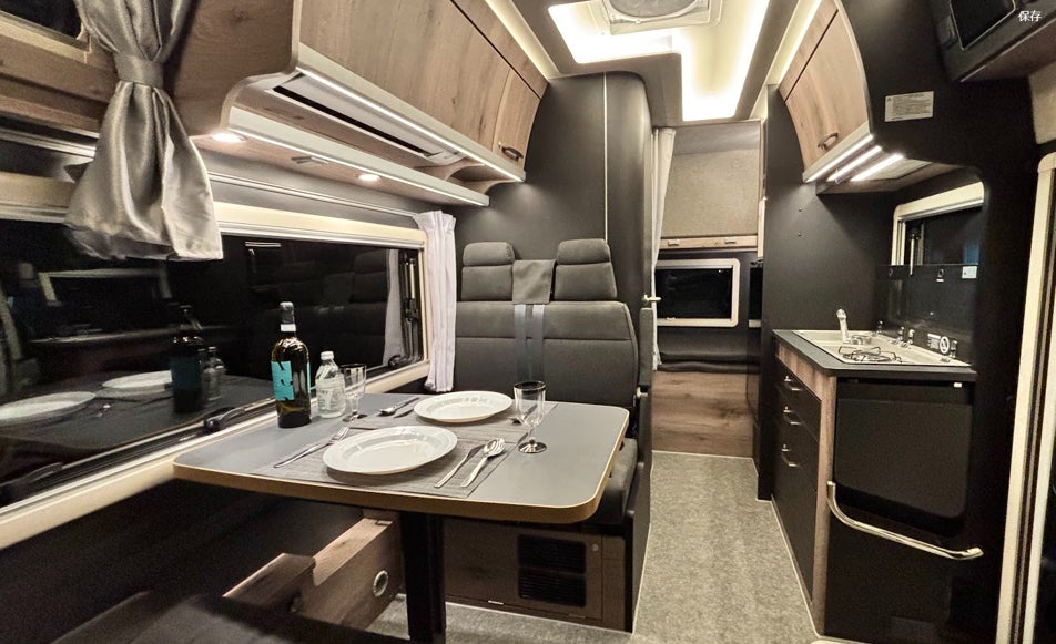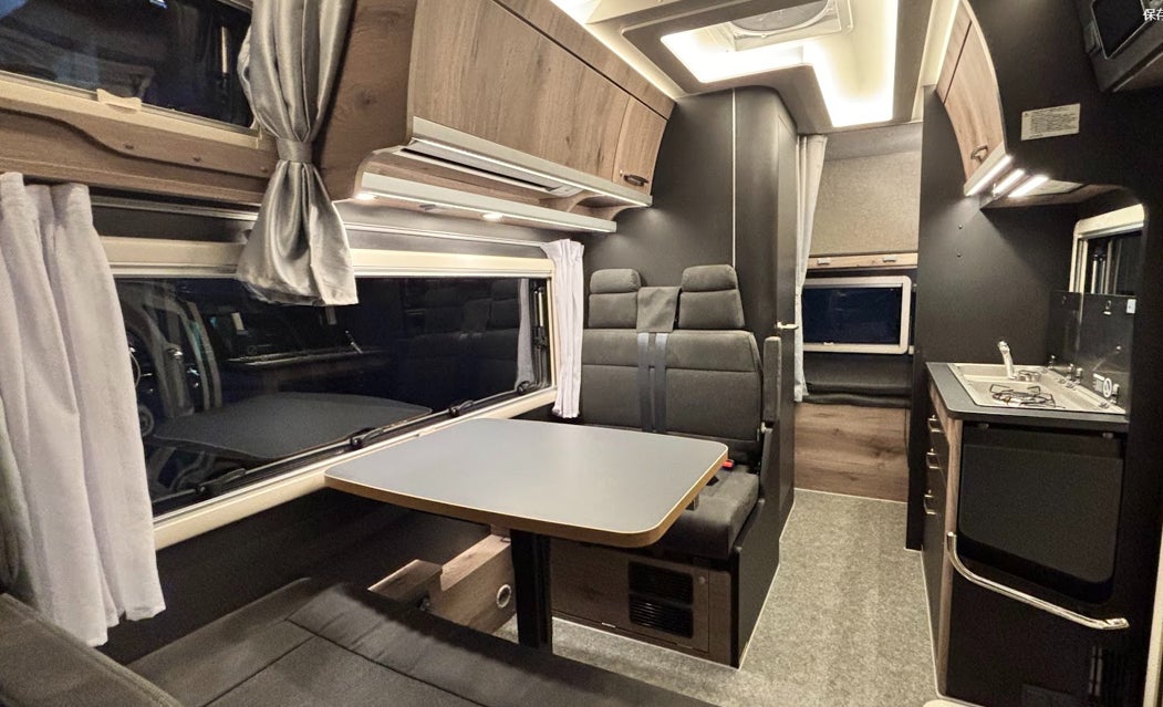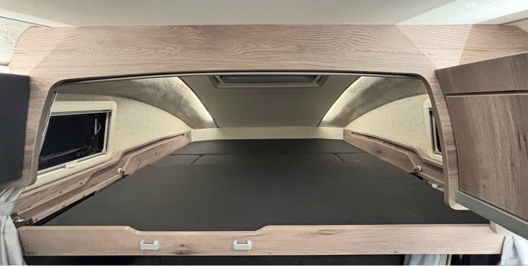 ホームエアコン、85L冷蔵庫(12L冷凍庫内蔵)、電子レンジ、ステンレスシンク&2バーナーコンロは勿論のこと、250Wソーラーパネル、サイドオーニング、外部収納庫、床下収納庫、マックスファン、アクリル2重窓、スライド式バンクベッド、上下左右にスライドする可動式テーブル、後部2段ベッドが標準装備され、充実した多彩な機能が快適な旅を支えます。北欧調インテリアが大人の落ち着いた空間を演出します。