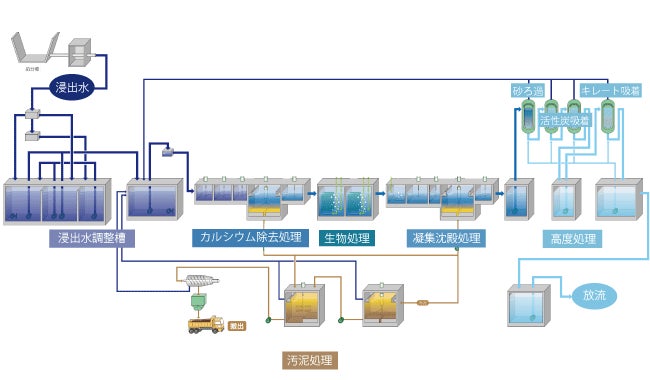 浸出水の流量調整⇒カルシウム除去⇒生物処理⇒凝集沈殿処理⇒高度処理(砂ろ過⇒活性炭吸着⇒キレート吸着)⇒下水道放流 |