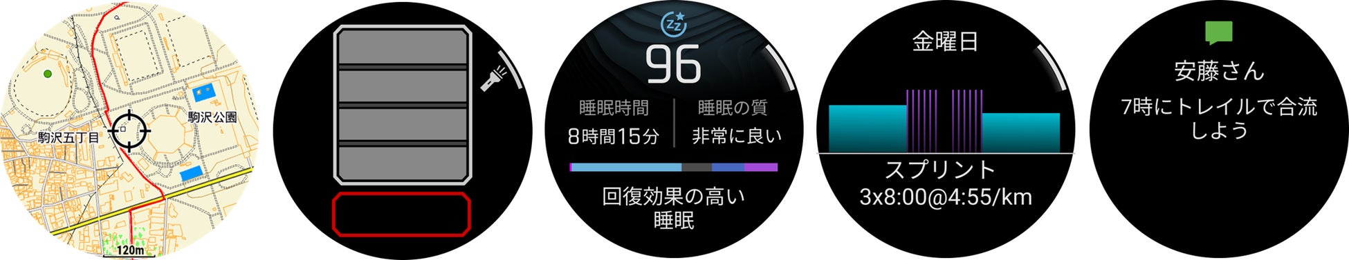 さらに、目標距離を指定するとウォッチがランニングルートを自動作成しナビゲーションを開始する機能が進化し、「ダイナミックラウンドトリップ」として、ランニング中にコースを外れてもルートを自動で調整し、走行中にターンバイターンを案内し、出発地点から目標距離の近くまで確実に戻ることができるように。見知らぬ土地でのランニングも、安心して目標距離を達成できます。