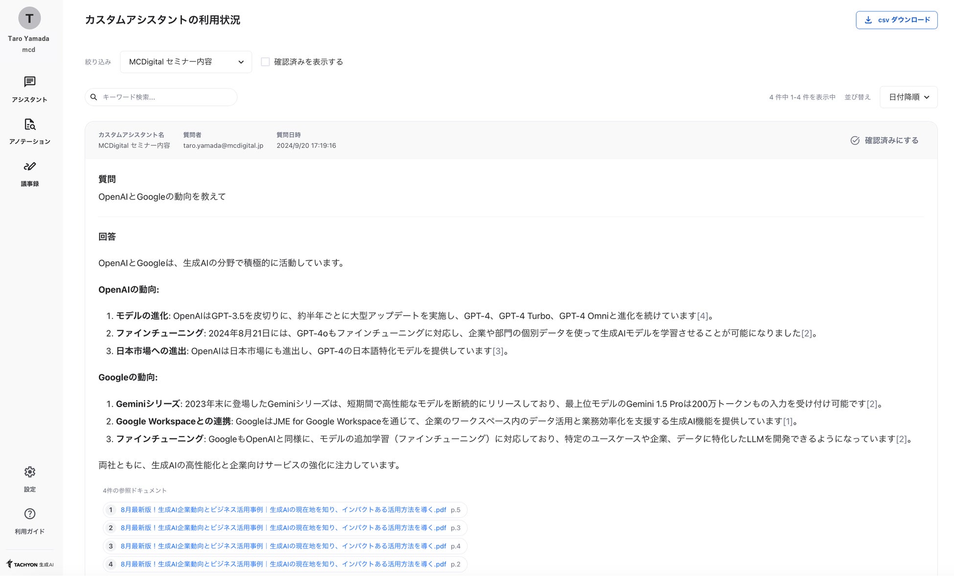 スタンダード型に問い合わせ履歴(ユーザーの入力と生成AIの出力)を確認可能な機能を搭載したタイプ。こちらは、管理者権限を持つユーザーのみ作成・編集可能。