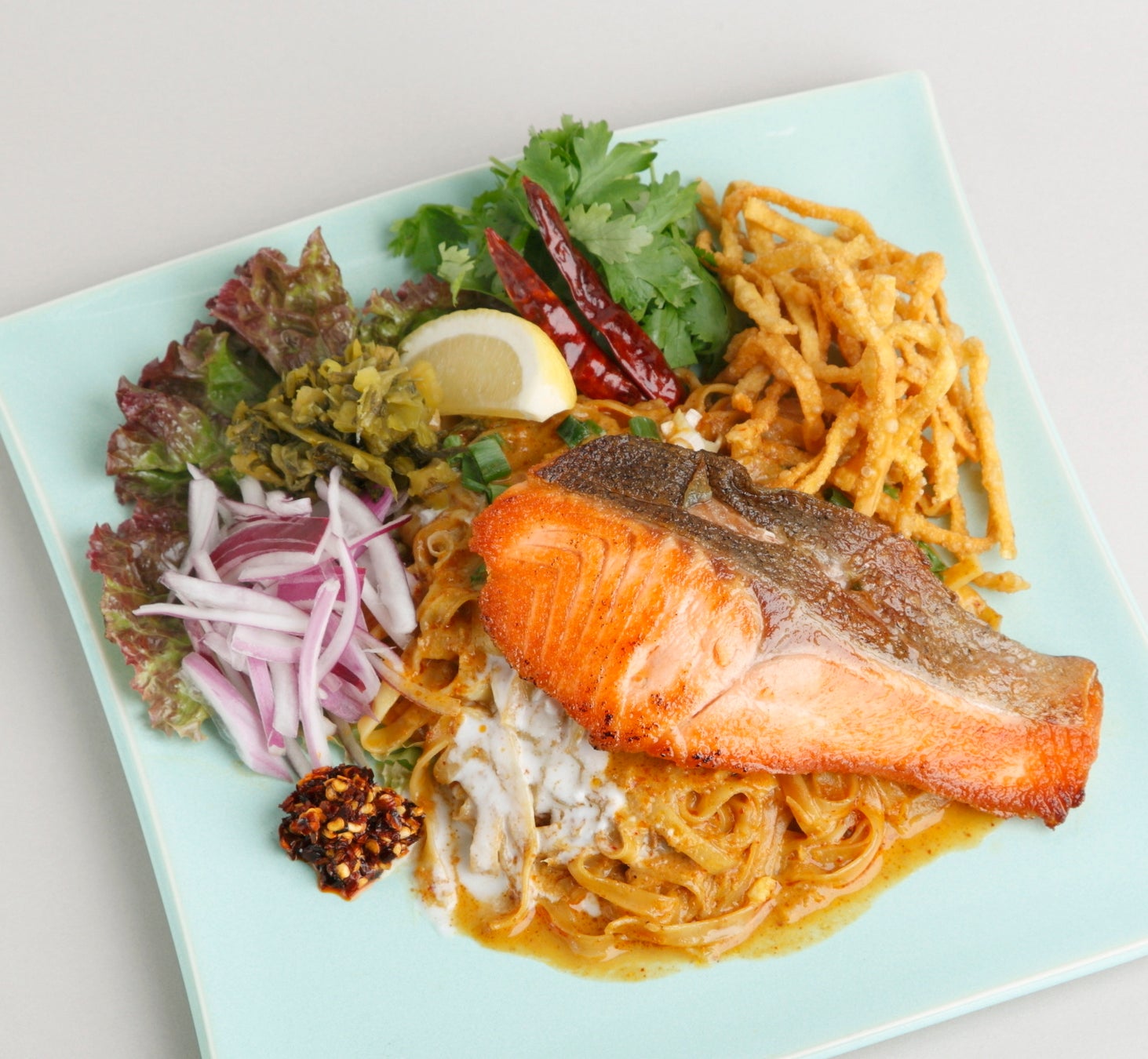 濃厚なココナッツカレーソースをかけた特製カオソーイ(麺)に北海道二海サーモンの大きな切り身を焼いて贅沢に合わせ、揚げたカオソーイも添えました。口いっぱいに上質な旨みと香りが広がります。