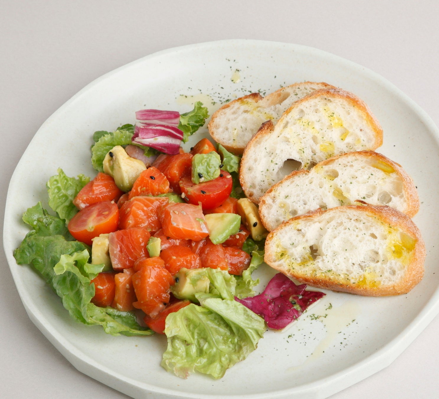 北海道二海サーモンの魅力を存分に生かし、アボカド、ミニトマトとワサビオイルでさっぱりと仕上げたポキです。オリーブオイルを垂らしたバケットと一緒に召し上がれば、美味しさがさらにアップ!