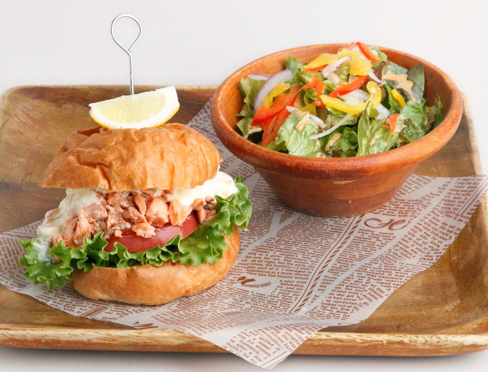粗めにほぐした北海道二海サーモンを、レモンバターと塩コショウでシンプルにソテーして、玉子たっぷりのタルタルソースとともに召し上がっていただくバーガーに仕上げました。サラダ付きでご提供します。