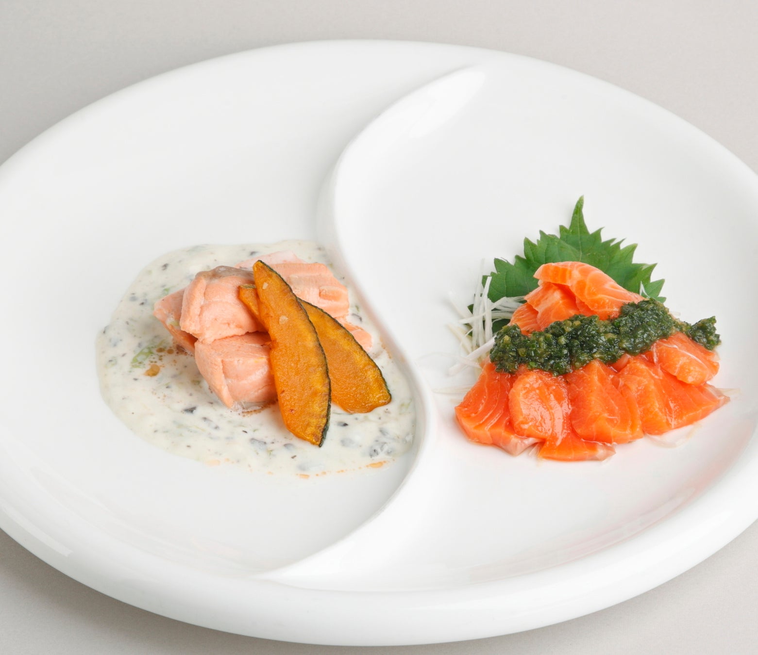 北海道二海サーモン二味 ~葱と山椒のソース、トリュフのクリームソース~