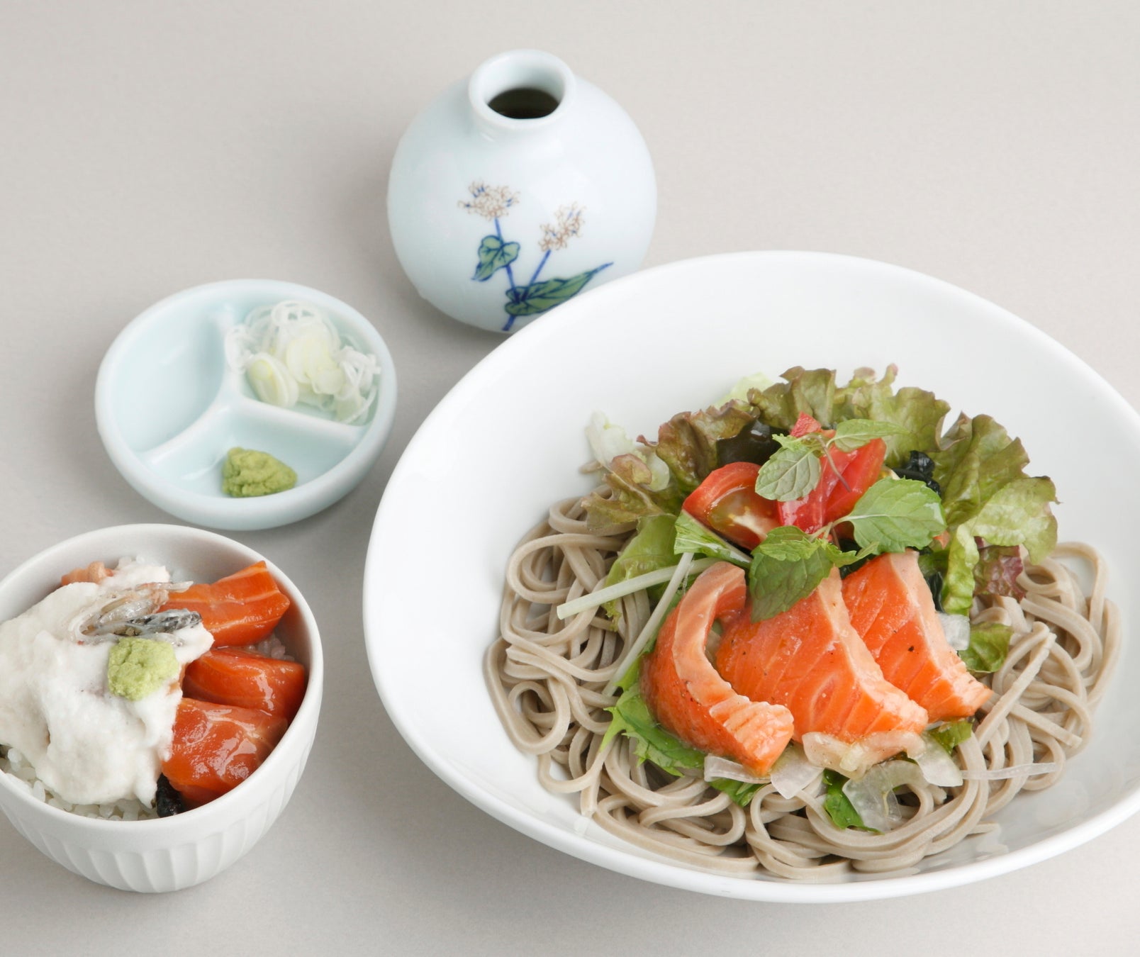 北海道二海サーモンマリネのサラダ蕎麦と漬け山かけ御飯
