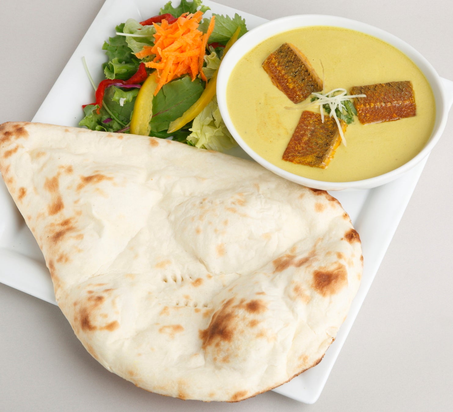 南インドと北海道の絶品コラボカレー!カレーリーフとほのかなマスタード風味が特徴のココナッツミルクのルーが、焼いて厚くカットした北海道二海サーモンの上品な美味しさを引き立てます。ナンまたはライスをお選びください。
