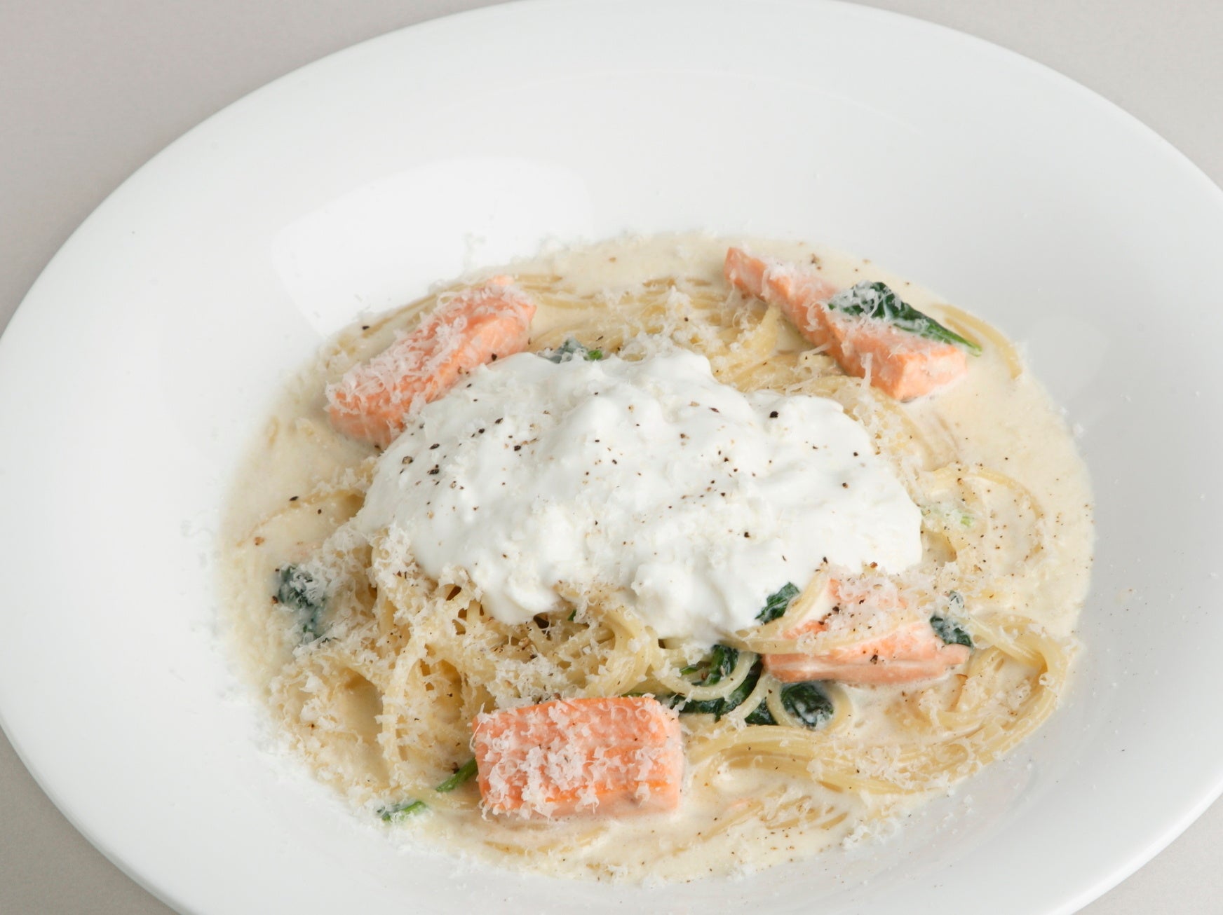 北海道二海サーモンとフレッシュモッツァレラチーズのクリームソース