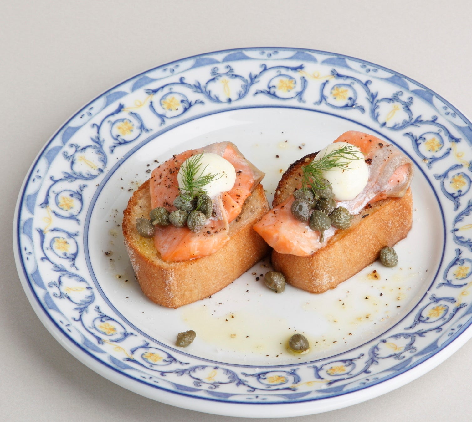 北海道二海サーモンを使用したスペインの定番料理「ピンチョス」です。脂ののった生の北海道二海サーモンをバケットに乗せ、レアになるように丁寧に火入れをして、アイオリソースで仕上げました。とろけるサーモンの凝縮された旨みが魅力です。