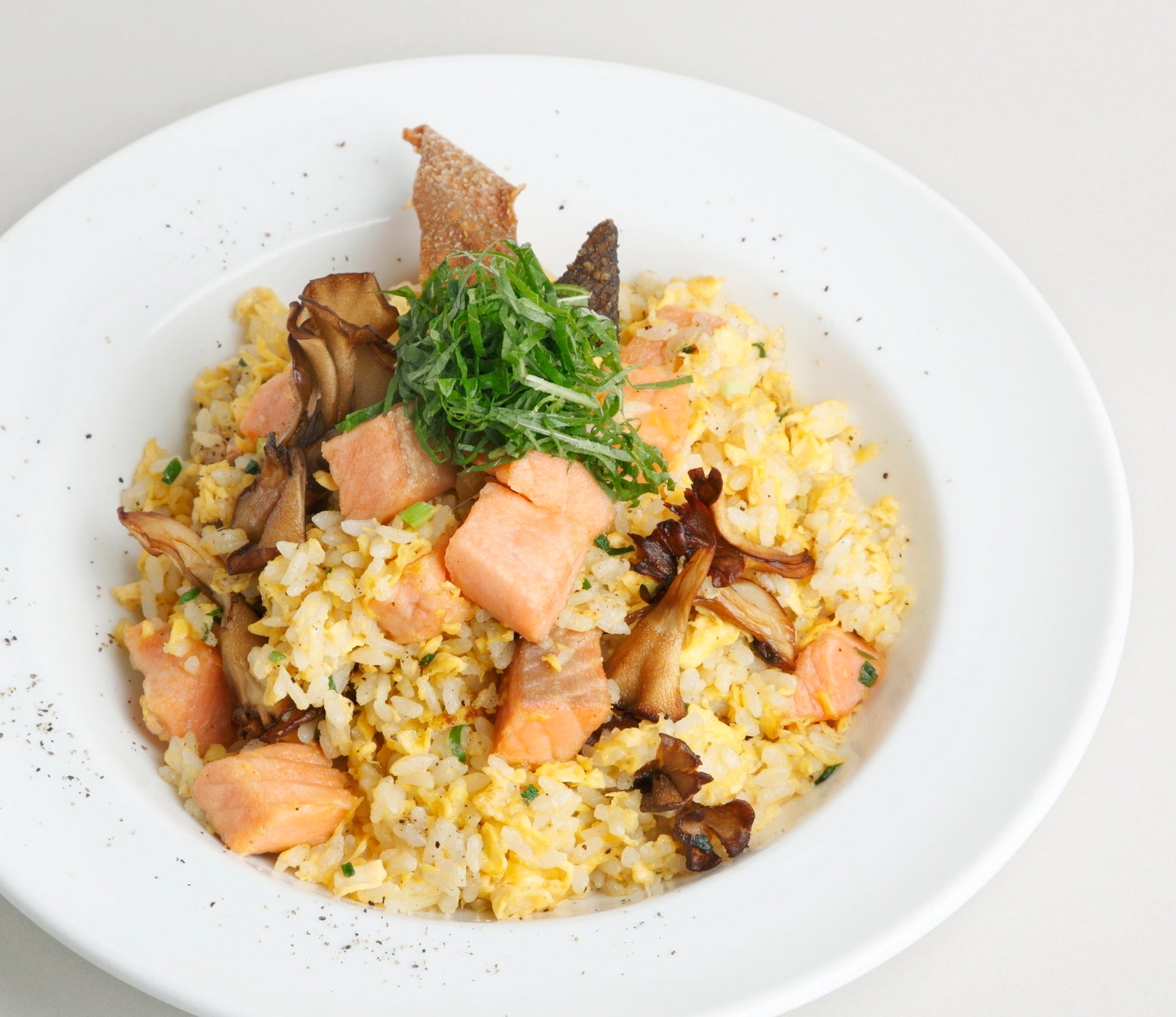 北海道二海サーモンと大葉、舞茸などシンプルな食材で仕上げた炒飯です。サーモンを大きめの角切りにしてたっぷり豪快に使っているので、美味しさをしっかり感じられます。