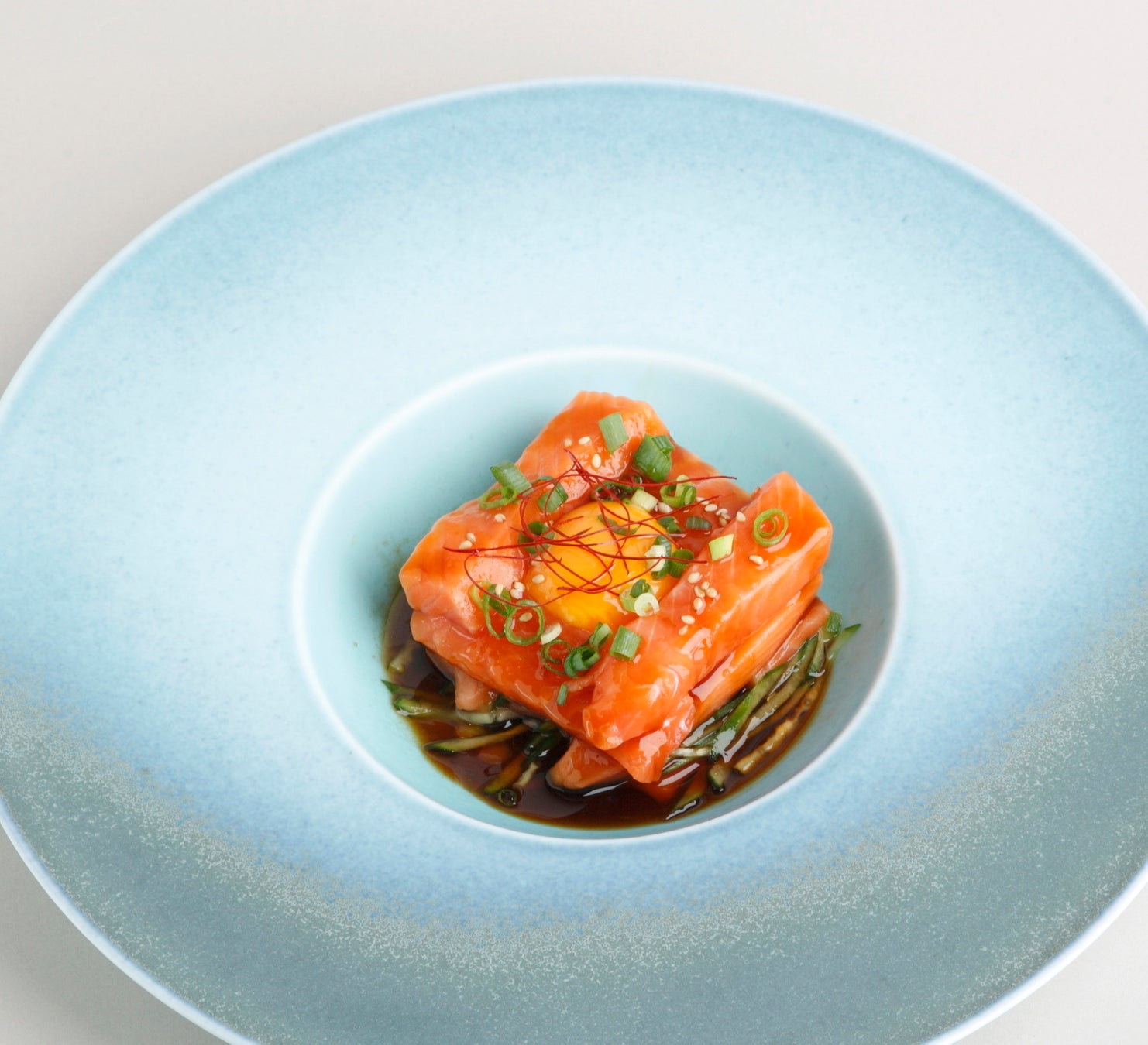 焼肉屋の人気メニューを、北海道二海サーモンをたっぷり使って再現しました。濃厚な卵黄と甘めの特製タレと一緒にいただく、とろけるようなサーモンの味わいは格別です。