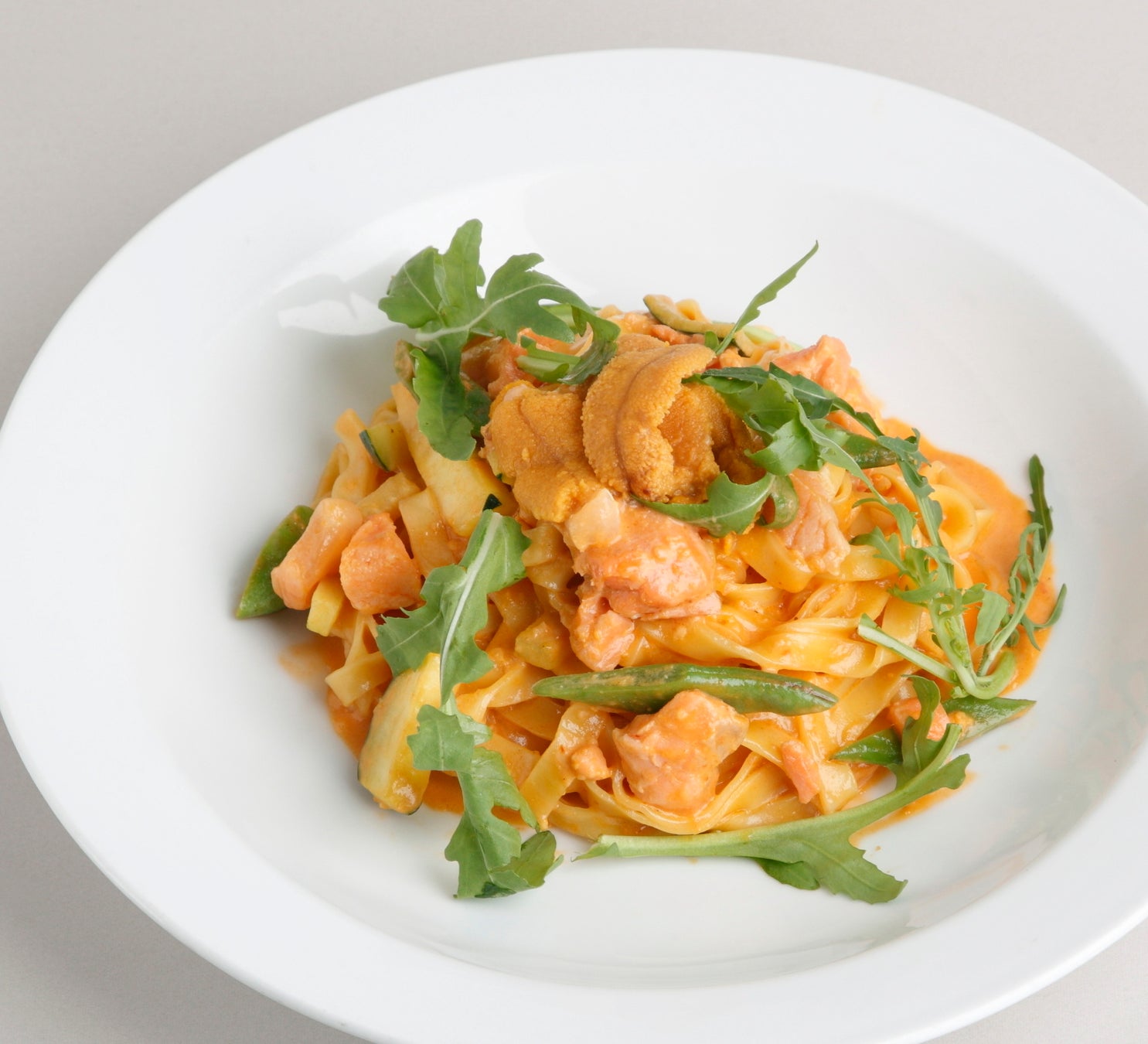 当店で人気のウニクリームソースに、脂がのったコク深い北海道二海サーモンを合わせ、さらにウニをトッピング。期間限定の贅沢なパスタに仕上がりました。
