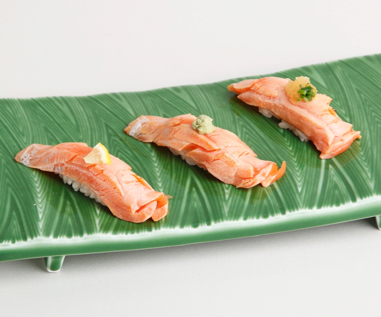 脂がのっていてトロッとした味わいが特徴の北海道二海サーモン。当店ではひと手間かけて、炙りでご用意しました。写真左より塩レモン、ワサビしょうゆ、おろしポン酢でお召し上がりいただく食べ比べセットです。