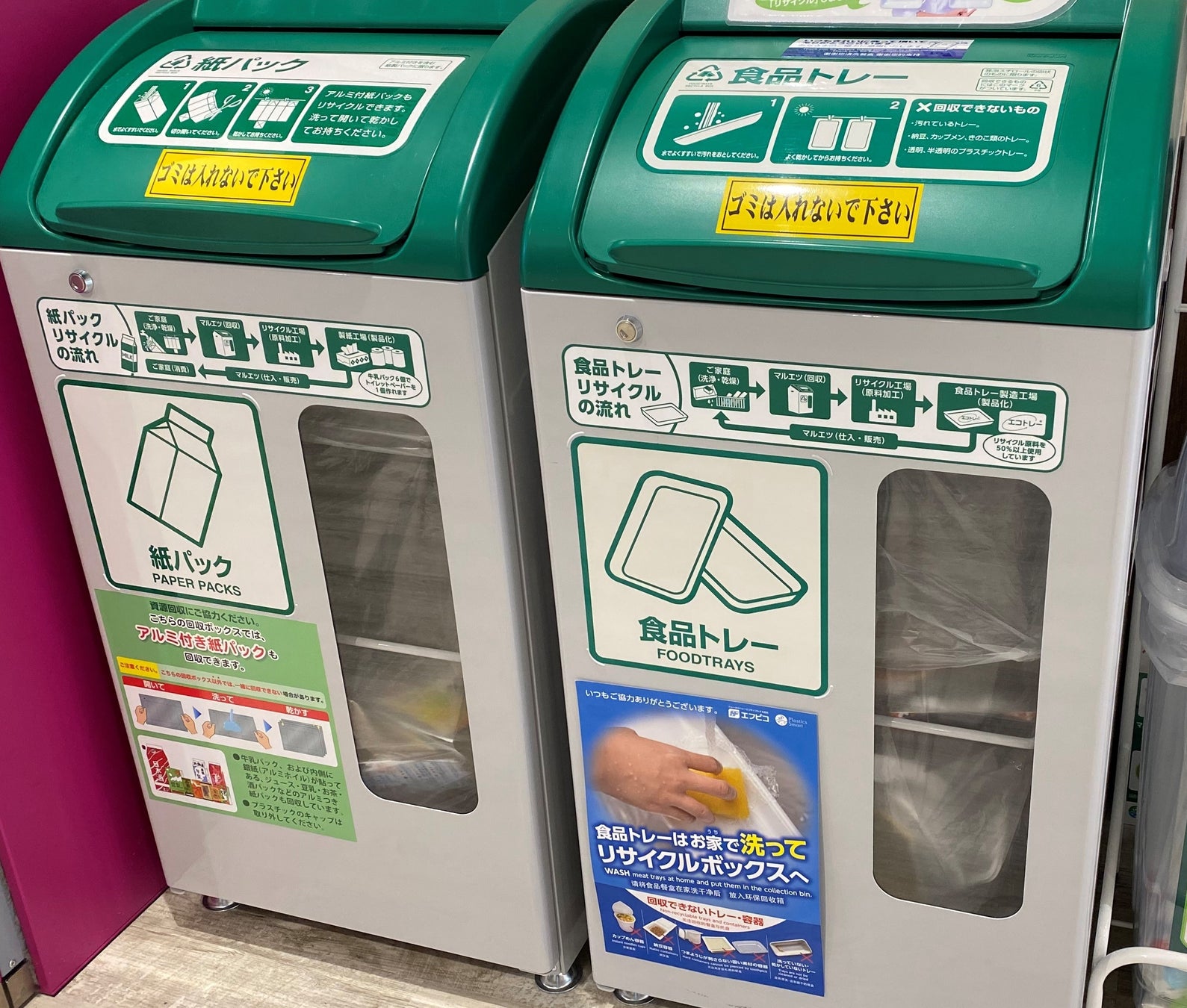 リサイクルボックスを設置し、食品トレイや紙パックなどを回収