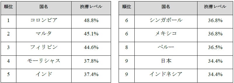 トムトムが世界各地の走行速度データを集計・分析した結果、世界の平均渋滞率は 20% から 25% へと 5 ポイント上昇し、明確な増加傾向にあることが明らかになりました。国別では、コロンビアが平均渋滞率約50%で首位となり、日本は約34%でインドネシアと並ぶ9位で、アジア地域ではフィリピン、インド、シンガポールに次ぐ4位の結果でした。