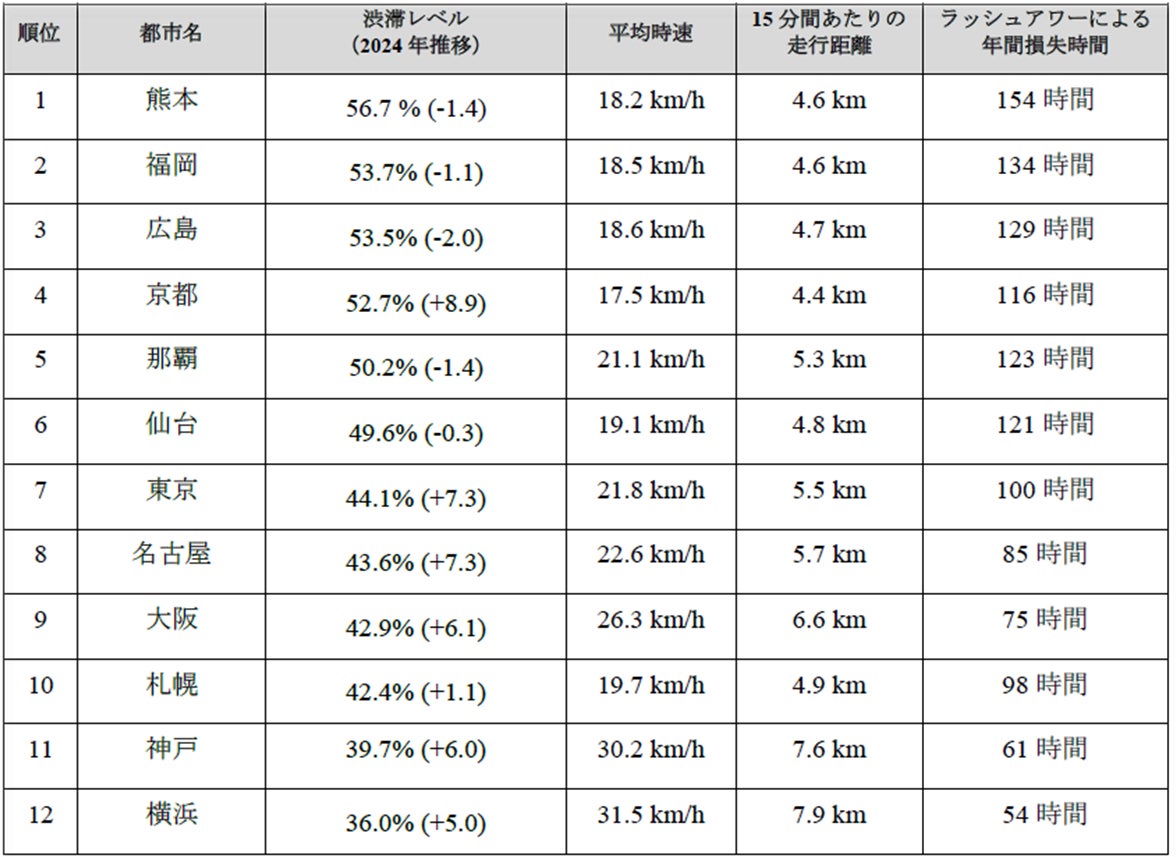 世界的に交通渋滞は増加傾向。日本はアジア地域で第4位の渋滞国。日本国内で渋滞レベル1位は熊本、ラッシュアワーの年間損失時間154時間。