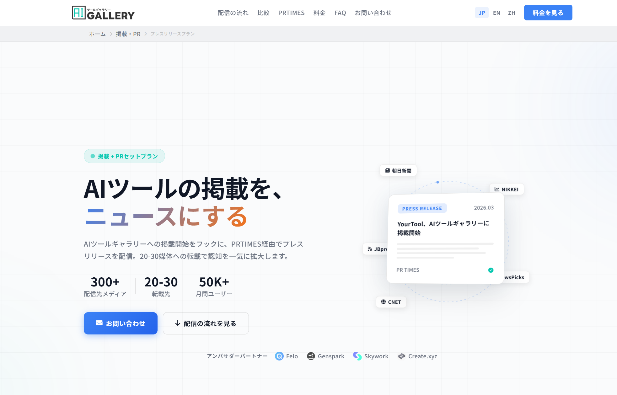 ・AIツールギャラリー掲載 ・日本語PR執筆 ・PR TIMES配信 |