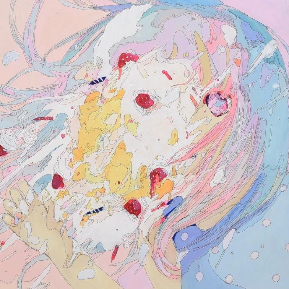 10代の頃から、床に落ちたケーキ溶けたアイス 割れたお皿、本来であれば残念な現象に魅力を感じ元々美しく可愛かった存在は例えその姿を保てなくなったとしても姿を変えて尚可愛いまでいられるのではないかと気づき、私の中で1番尊く、もう戻れないが故に執着している存在である少女でその表現を試みるようになった。感じた事、思いついた事を、とにかく早く形に残したい私にとって、アクリル絵の具はとても相性が良く、今日まで取り返しのつかない変化をしていく一瞬を残す為にアクリル絵の具で崩壊と形成を繰り返す 少女のようなものを描いている。