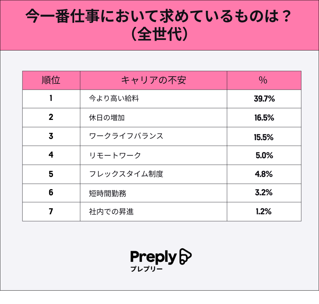 仕事において今一番求めているものは何ですか?と尋ねたところ、第1位は「今より高い給料(39.7%)」でした。続いて第2位が「休日の増加 - 週休3日など(16.5%)」で、休みが欲しいという人よりも、もっと稼ぎたいと考えている人の方が多いことが判明しました。