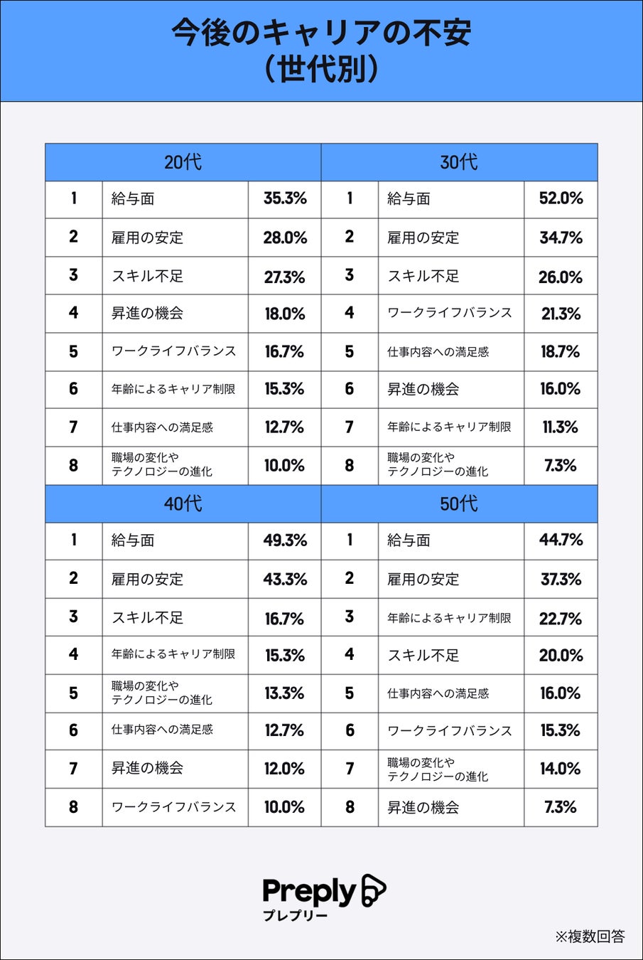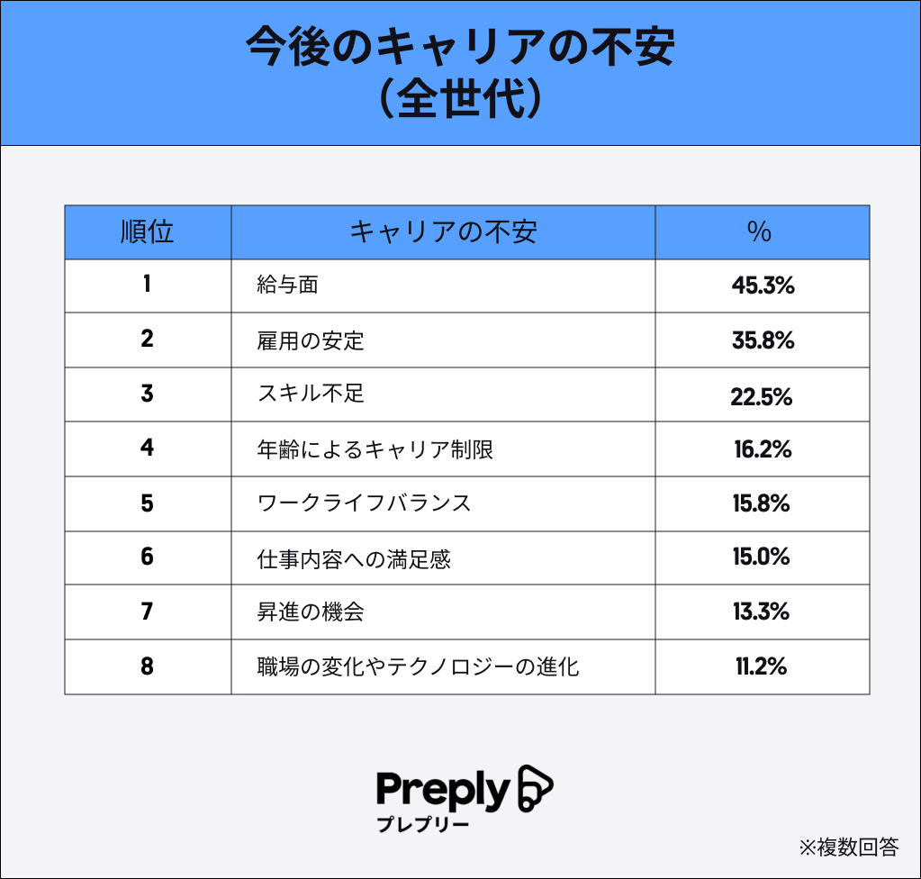 逆に20代は給与面と回答した人が35.3%で他の世代と比較すると少なく、スキル不足や昇進の機会の有無などにも不安を感じているようです。