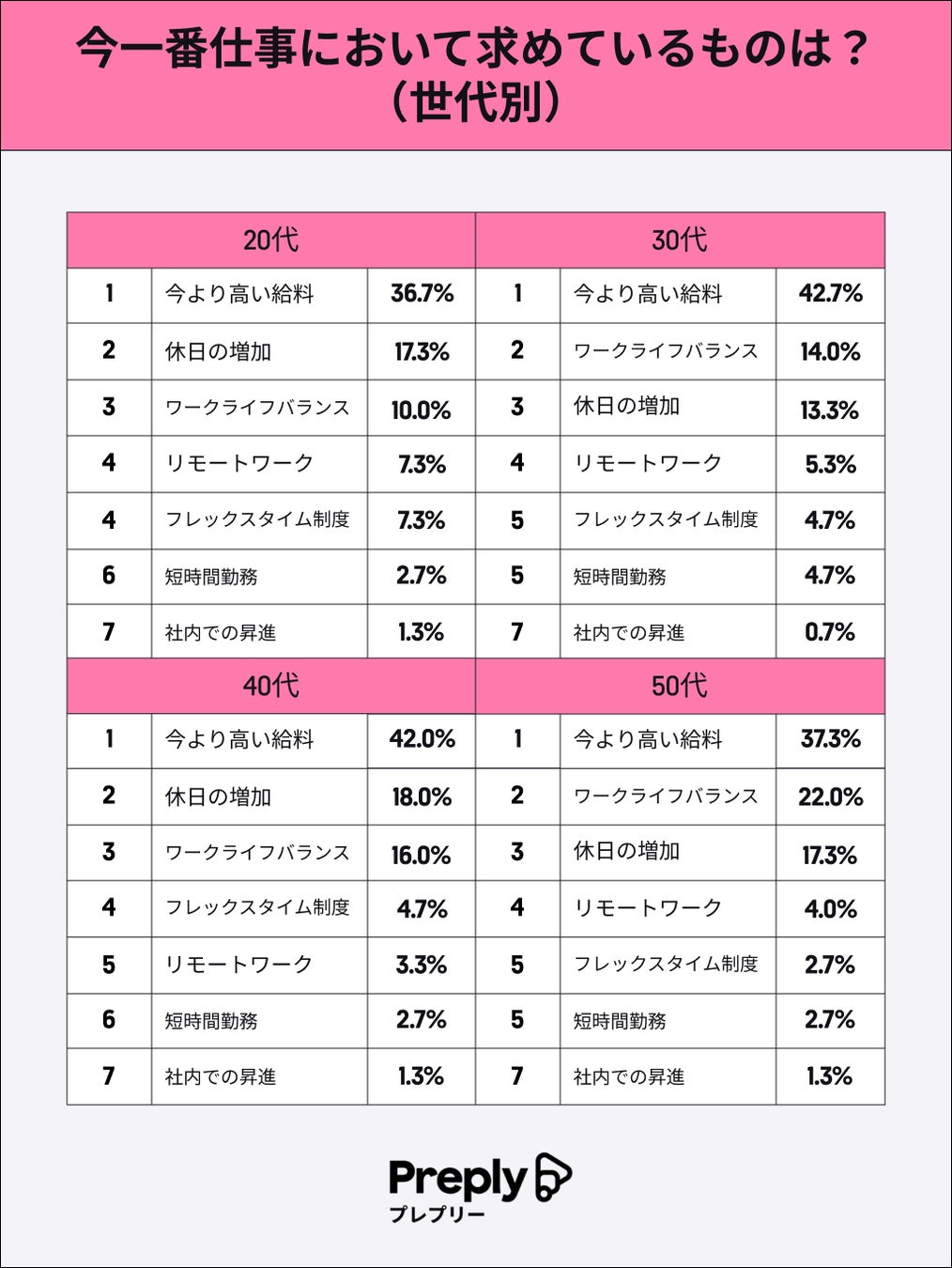 20代を見てみると、今一番求めているものとして「リモートワーク」「フレックスタイム制度」と回答している人の割合が、他の年代よりも多いことが分かります。20代の若い世代は、より多様で自由な働き方を求めている傾向にあるようです。50代は特にワークライフバランスを求める割合が比較的高く、プライベートも重要と考える人も多いようです。