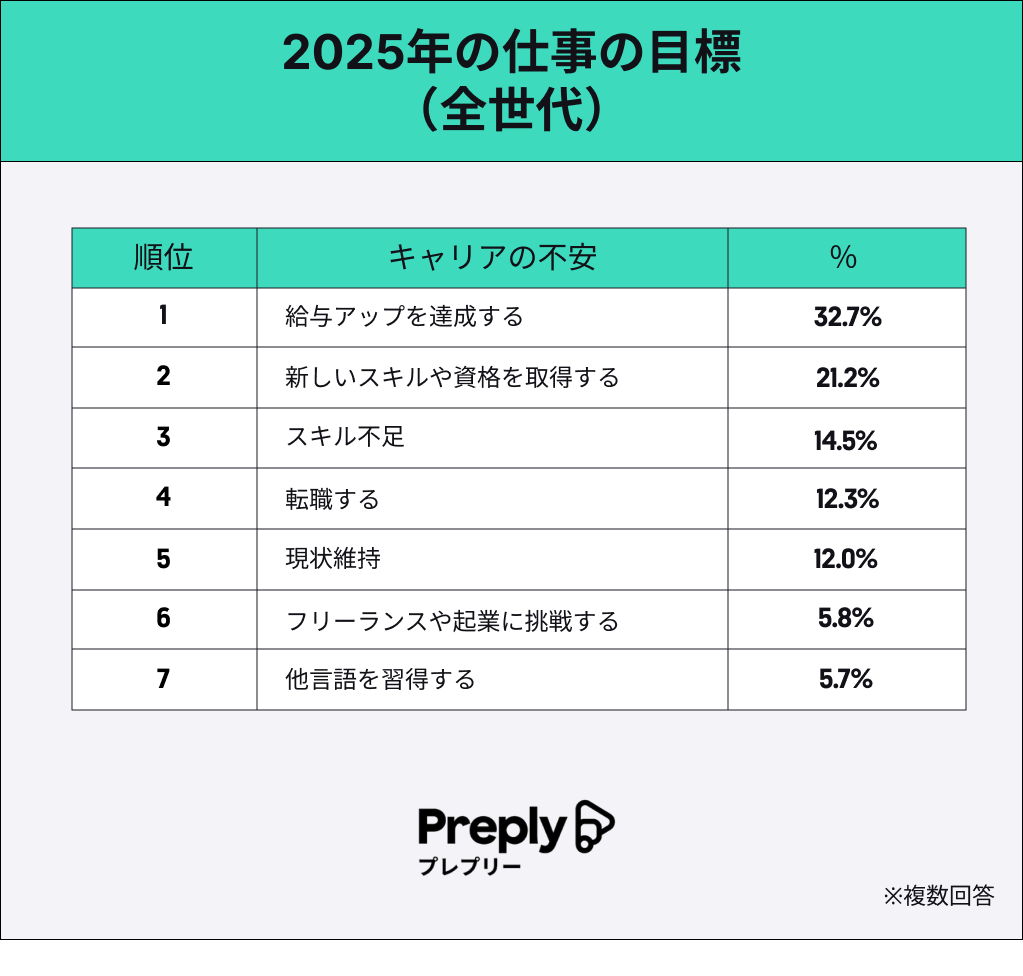 また、来年2025年の仕事の目標を尋ねたところ、第1位は「給与アップを達成する(32.7%)」でした。続いて第2位は「新しいスキルや資格を取得する(21.2%)」、第3位は僅差で「転職する(12.3%)」でした。