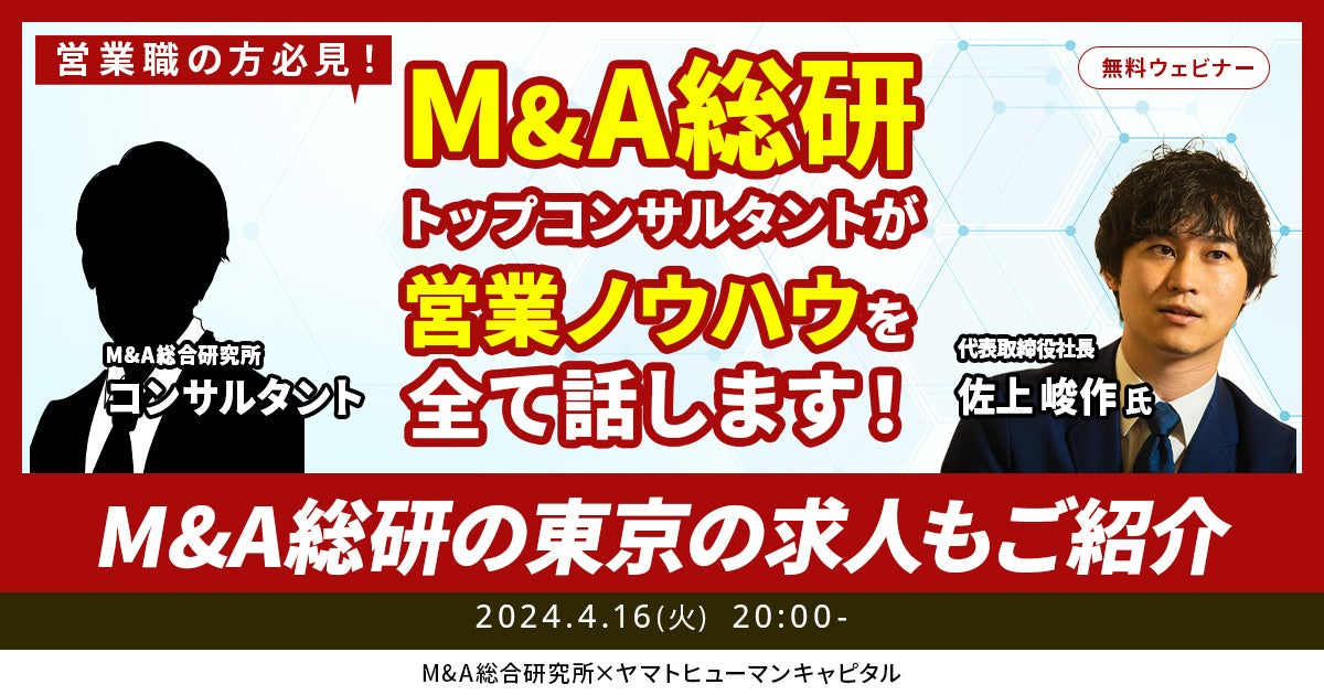 ヤマトヒューマンキャピタル株式会社(本社:東京都千代田区、代表取締役:堀江 大介)は、2024年4月16日(火) 20:00よりオンラインにて、株式会社M&A総合研究所代表取締役社長佐上峻作氏にご登壇いただくウェビナー『 M&A総研トップコンサルタントが営業ノウハウを全て話します!』を開催いたします。